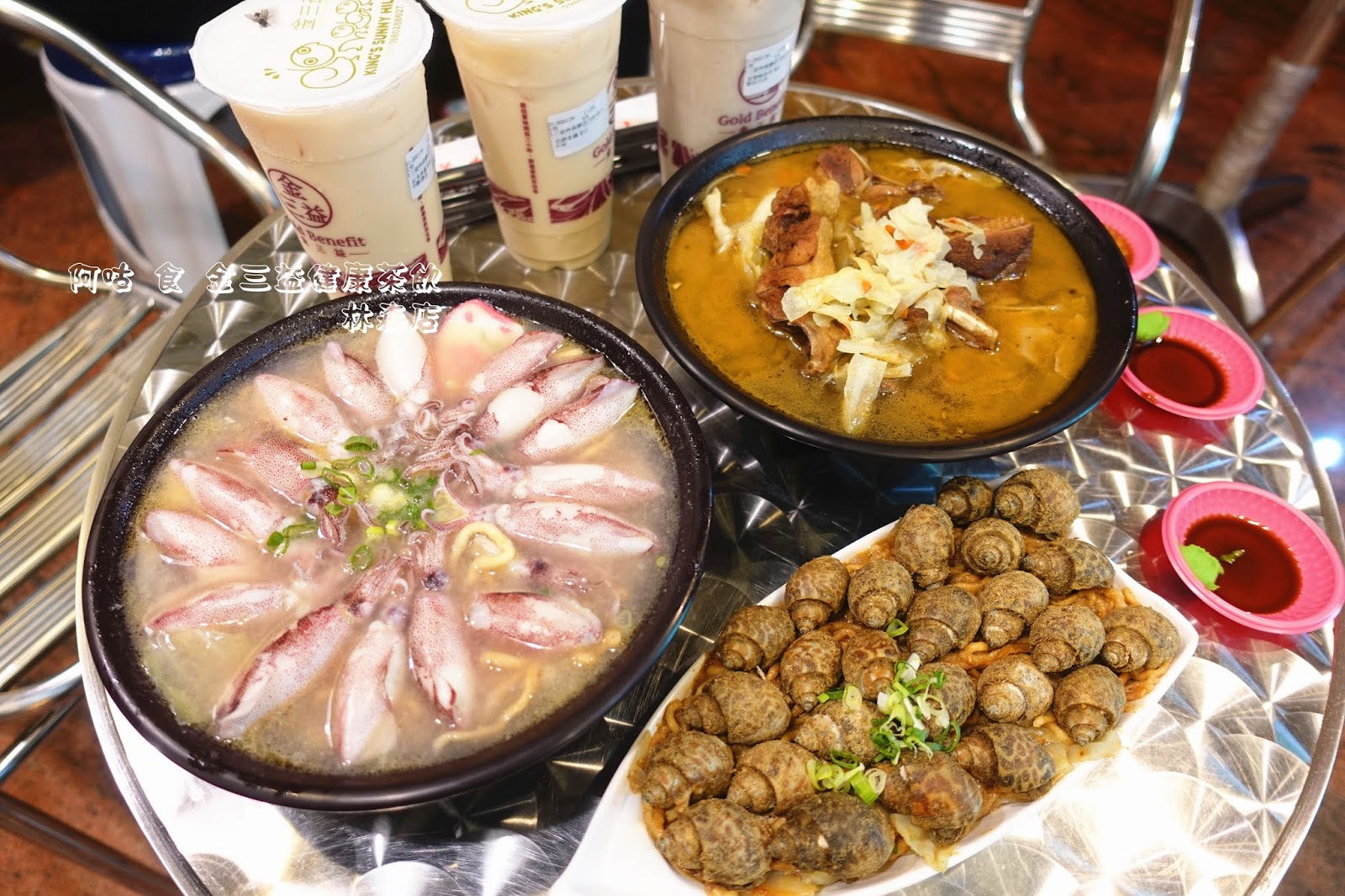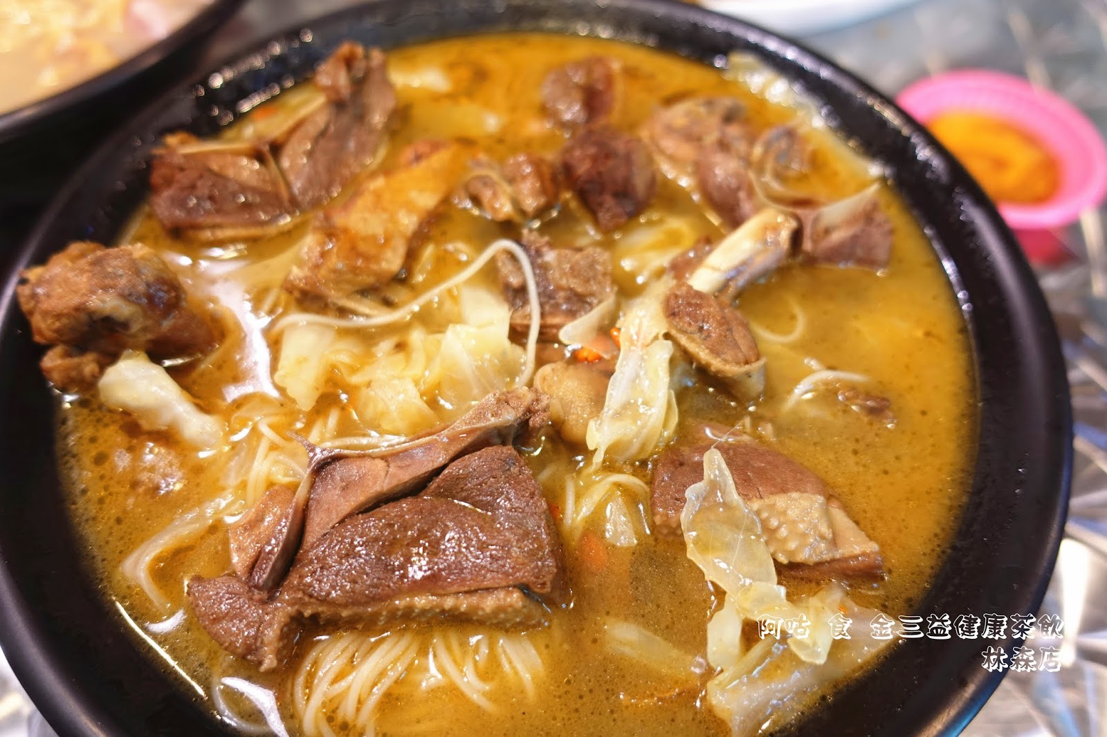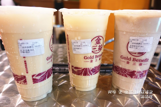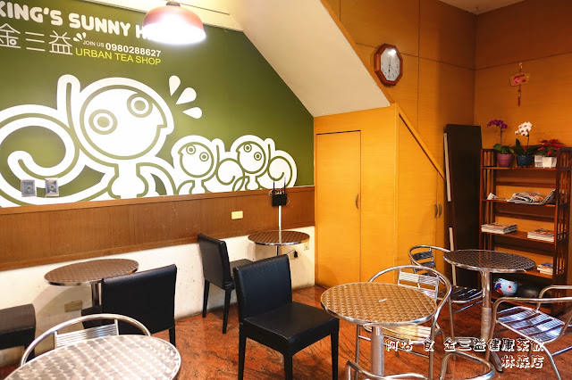 金三益健康茶飲兼賣飲品與鍋燒類麵食,是間複合式餐飲店,位在北區林森路三段上,停車頗為方便,其白底綠字的招牌在黑夜中很顯眼。