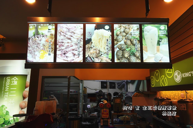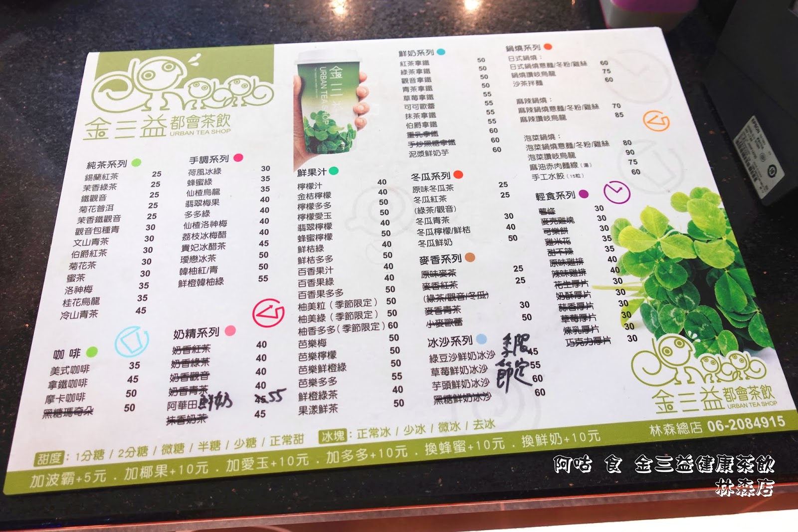櫃檯上有商品MENU,飲品方面有純茶、咖啡、手調、奶精、果汁、鮮奶、冬瓜、冰沙系列等品項;另有鍋燒麵點類,麵條有意麵與讚岐烏龍麵兩種,湯頭則分日式、麻辣與泡菜,另有乾式的沙茶拌麵與水餃可選。