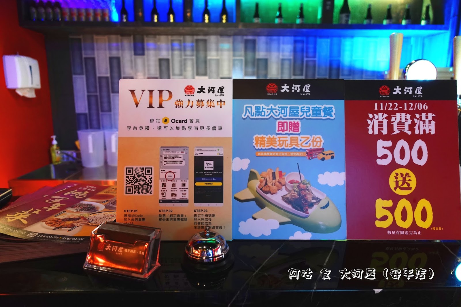 櫃檯上立牌分別是加入會員方式、兒童餐贈玩具與會員消費滿額送優惠券的訊息。