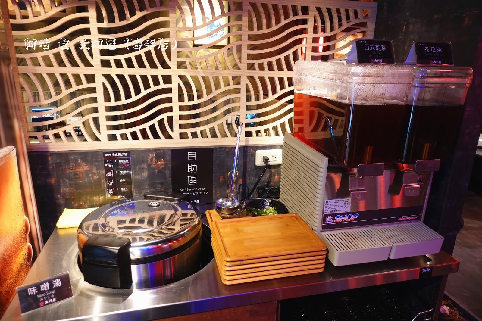 自助區則有味噌湯、日式煎茶(無糖)與冬瓜茶供內用客人無限自取。