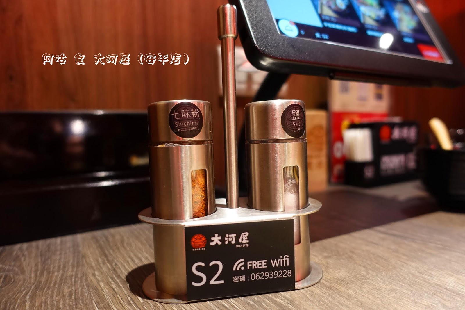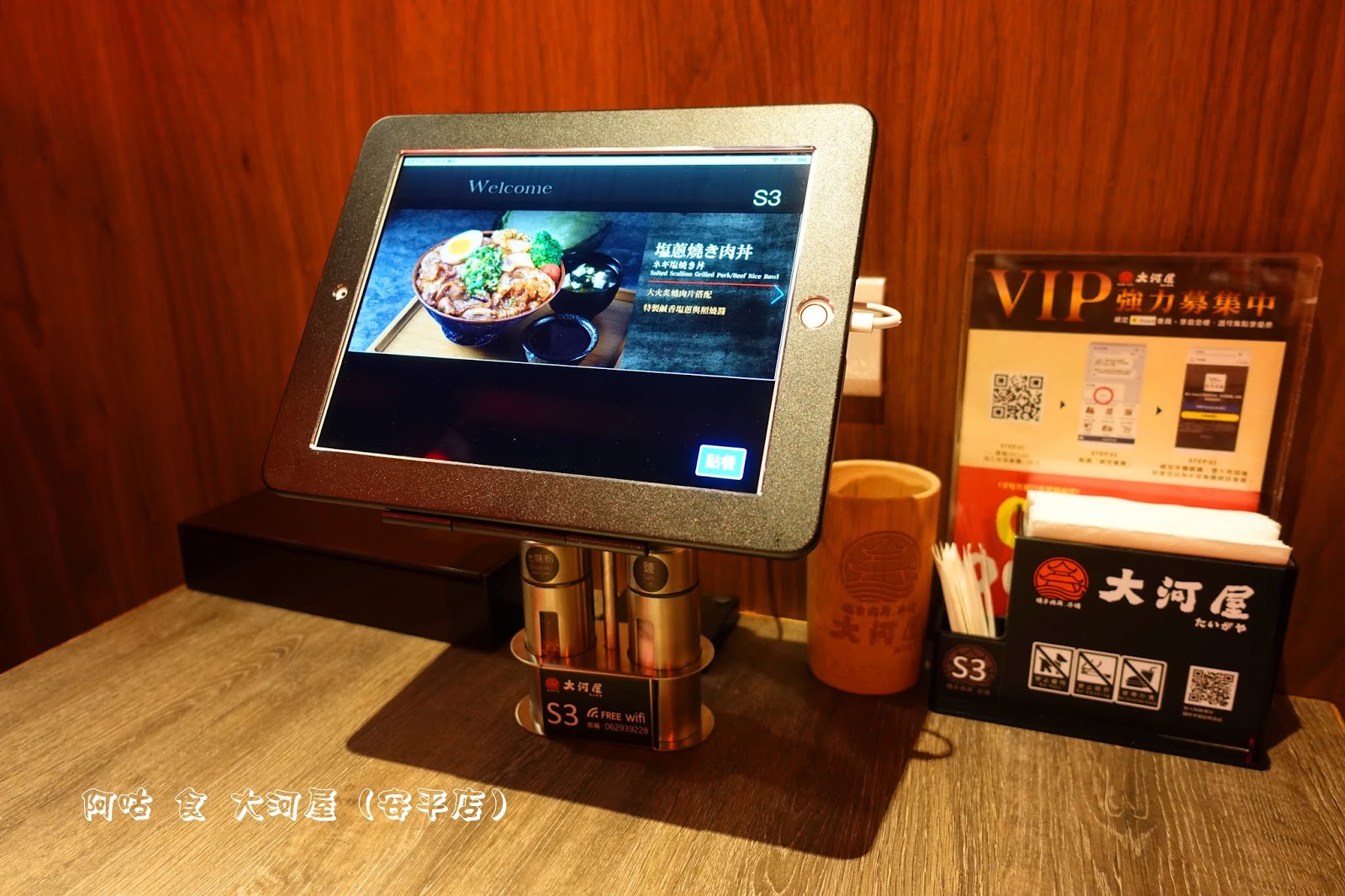 每組桌面皆擺放了MENU、餐具盒、餐巾、調味料、牙籤、加入會員教學、裝串燒竹籤用的木桶,並增設了自行點餐用的平板電腦。