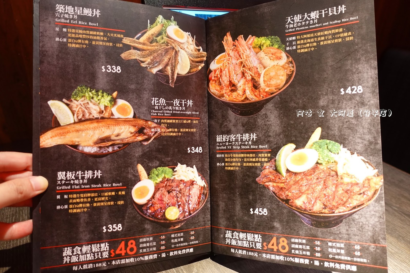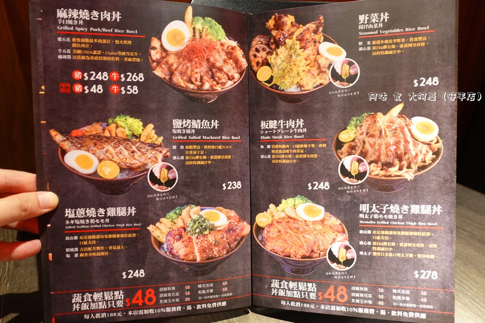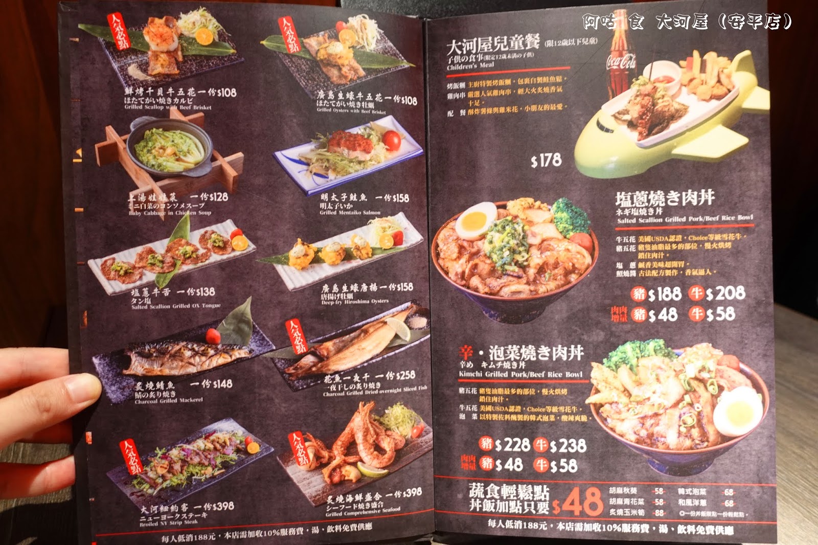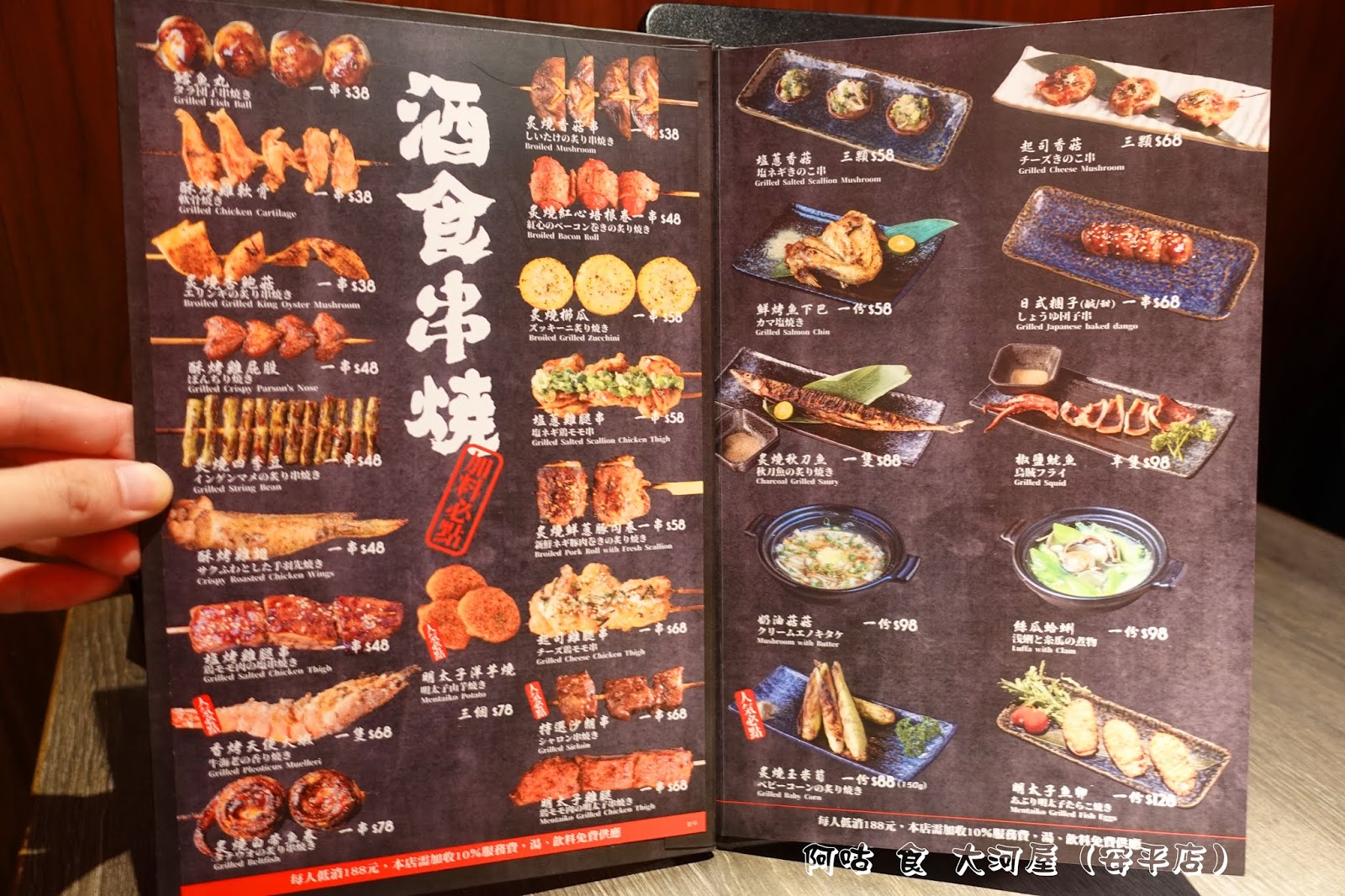 MENU上皆有美美的餐點實照與價位可參考,每人低消為 188元,需加收一成服務費,湯品、飲料為無限供應。