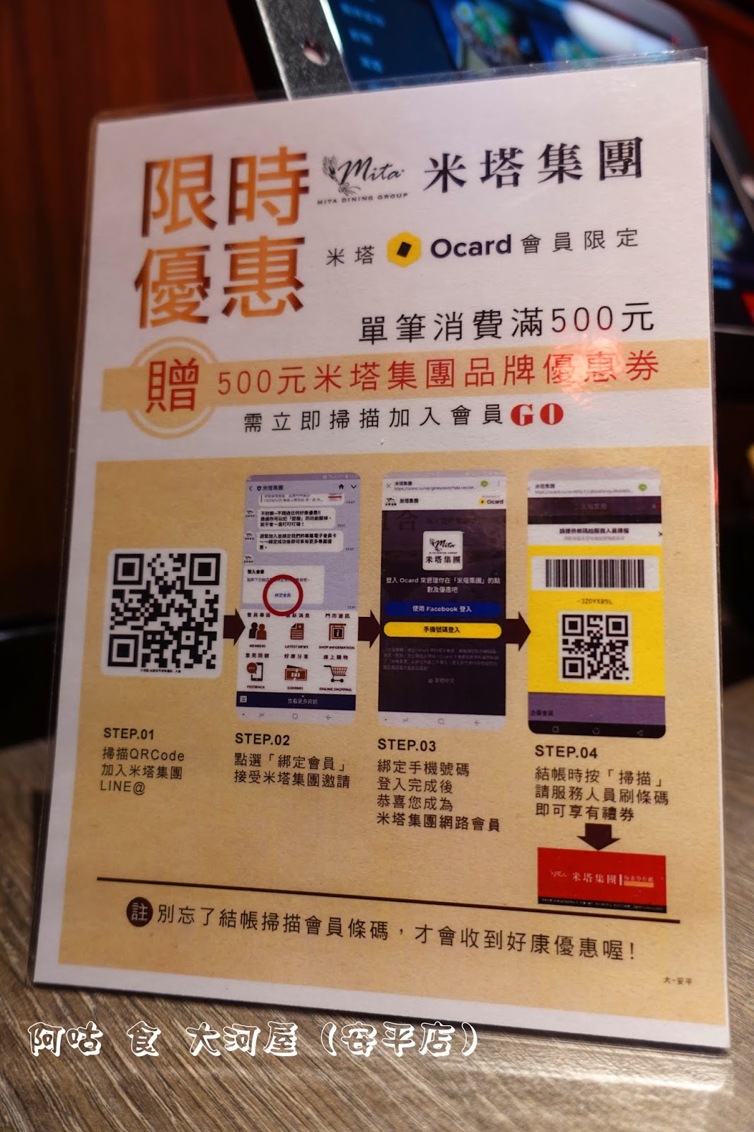 前陣子和家人到大河屋台南西門店用餐後,對餐點的好滋味留下不錯的印象,加上近期收到米塔集團發送的優惠簡訊,便趁前往家樂福購物時順道至新開幕不久的安平店用餐。