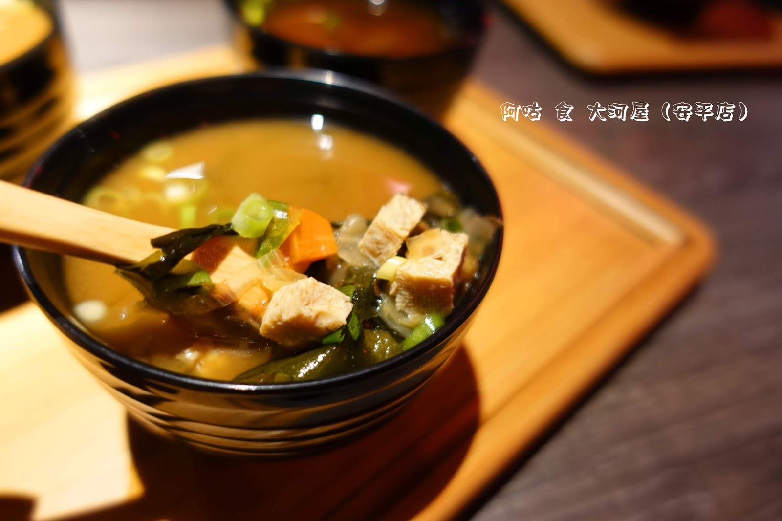 湯頭香氣濃郁,以柴魚片提味,滋味鹹鮮,內有凍豆腐、海帶芽、高麗菜、紅蘿蔔等用料,可自行添加蔥珠增添清爽的辛香。