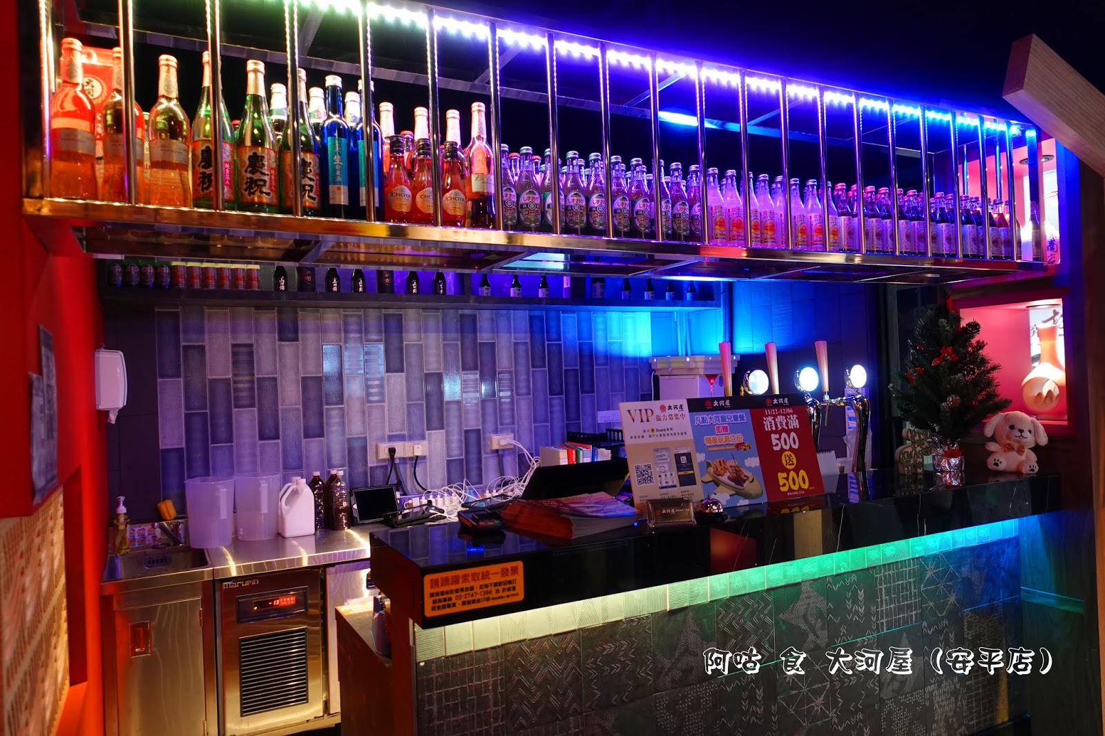 櫃檯上方以各式酒品陳列搭配霓虹燈作為裝飾。