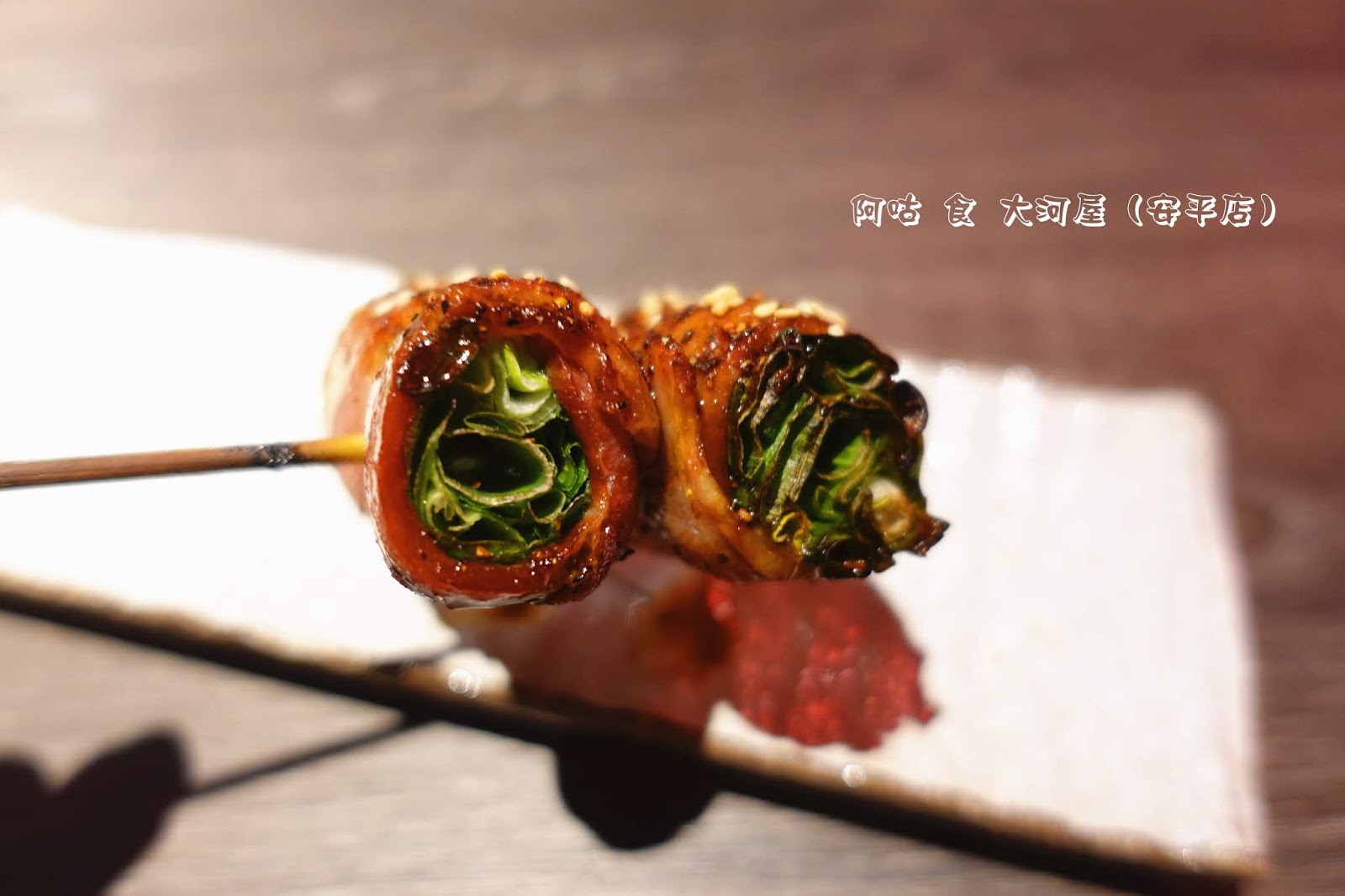 大把新鮮蔥段以均勻塗抹醬汁的培根肉片捲裹,撒上些許芝麻提香。