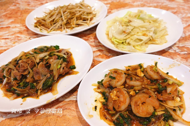 我們單點了鮮炒蝦仁與香蔥炒羊肉,圖中的高麗菜與豆芽菜皆為兩人份。