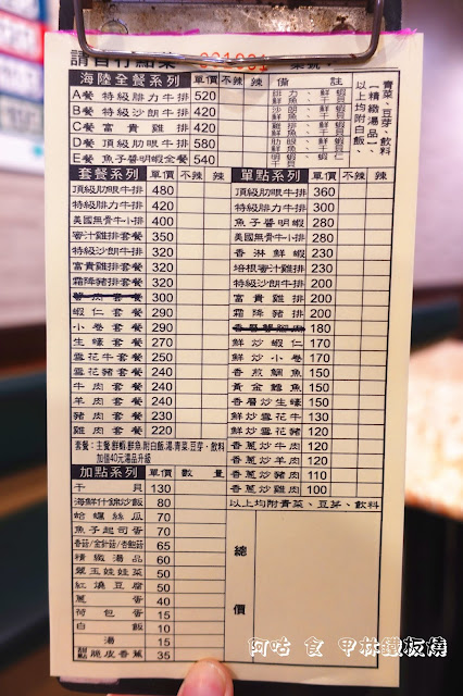 甲林鐵板燒提供的餐點主要分成三類,分別是包含多種主餐食材的海陸全餐系列、套餐系列以及單點,並有其他可加點的品項。