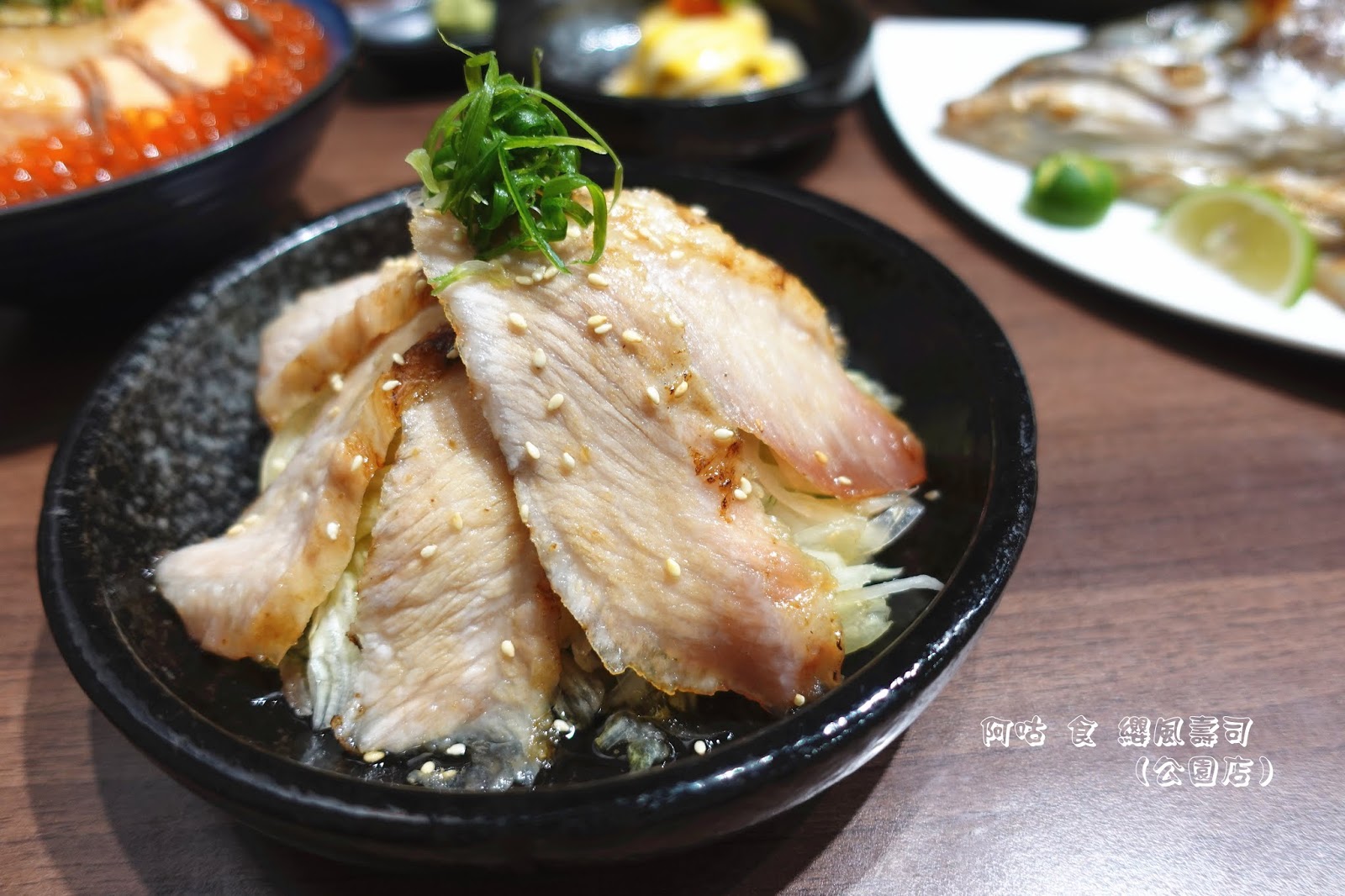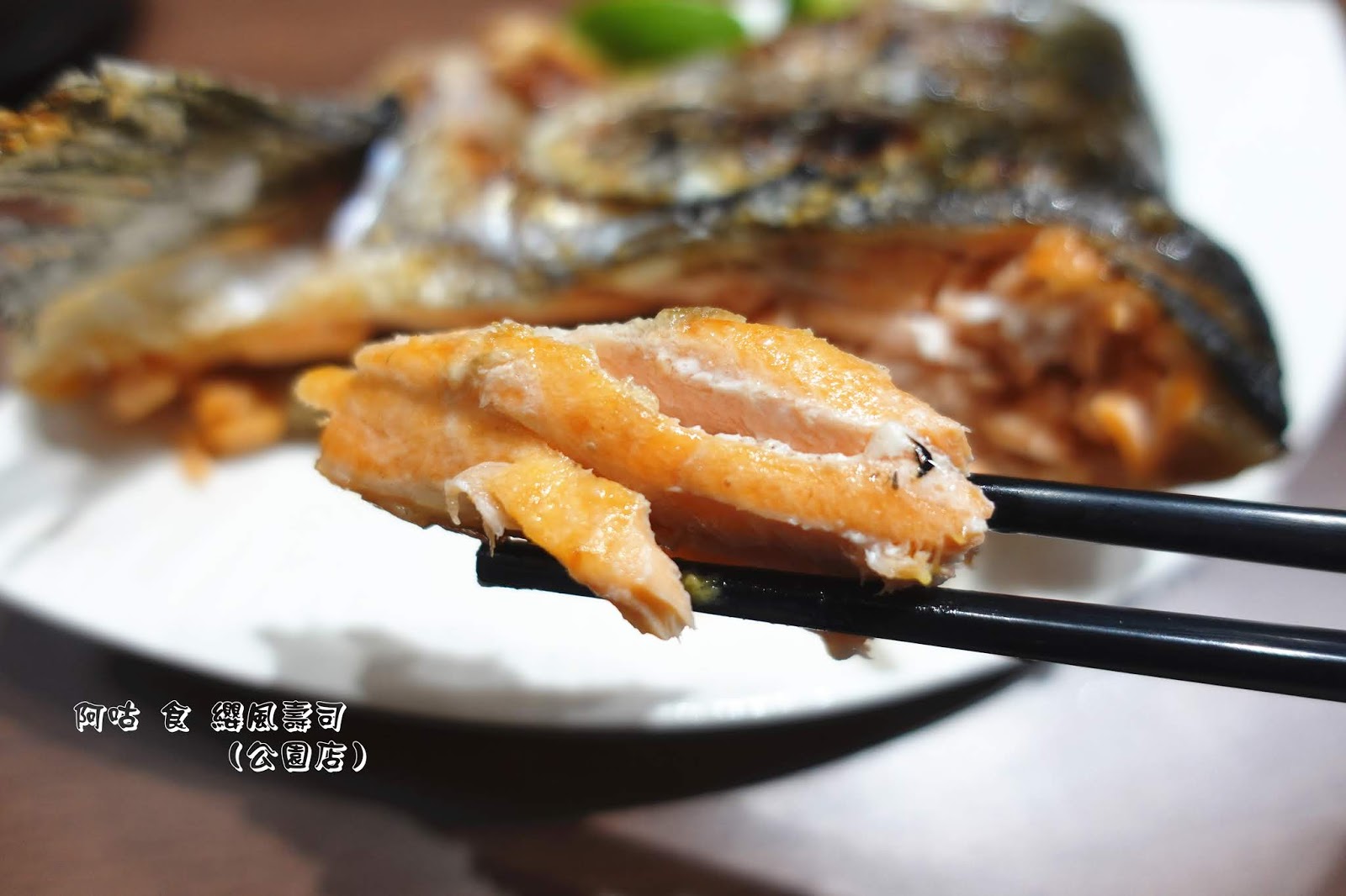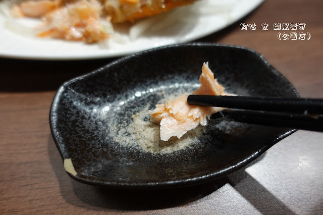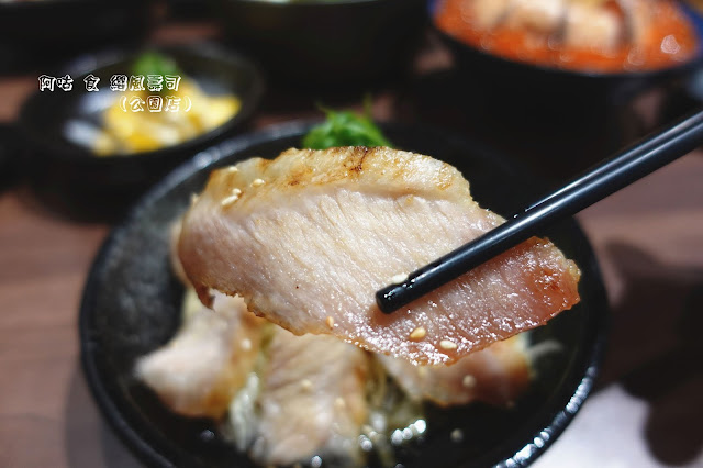 鮭魚肉因為厚切且經過燒炙,故腴滑鮮嫩的口感略帶緊實,魚肉自有的油脂甘香在咀嚼間則更顯濃郁。