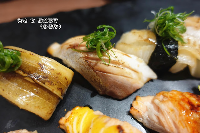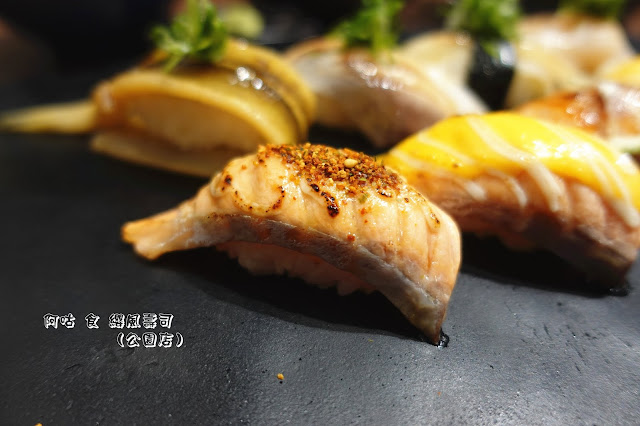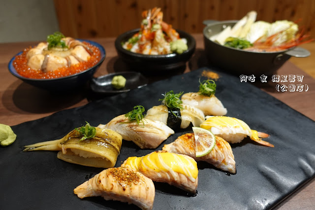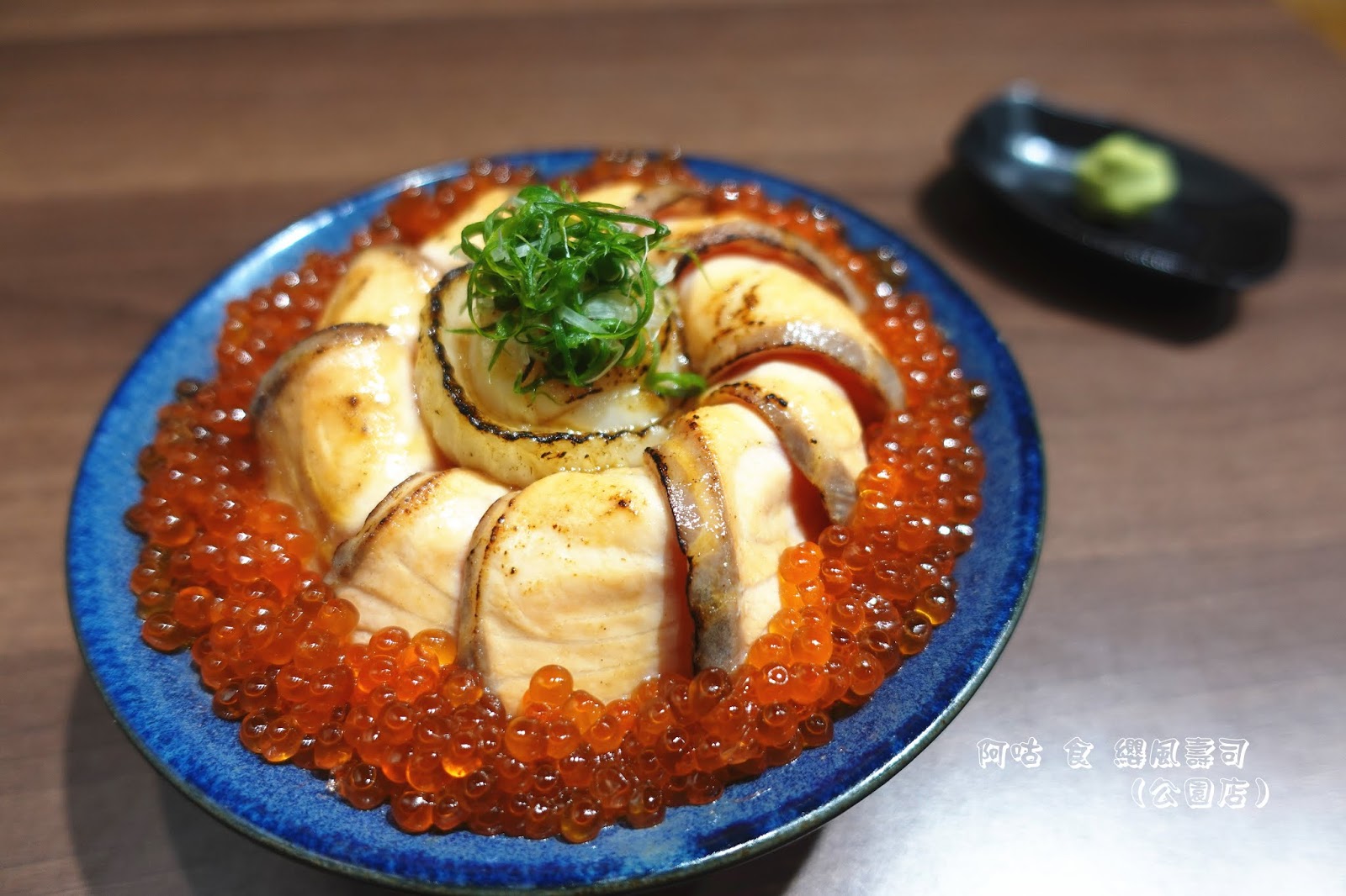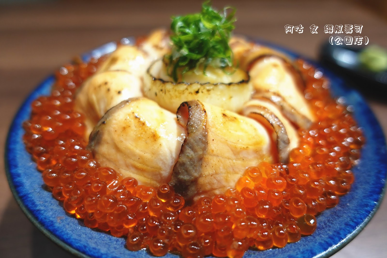 除了那眩目的燒炙厚切鮭魚與鮭魚卵外,中間的燒炙比目魚片與生食級干貝,也不甘落於其後地展現其存在。