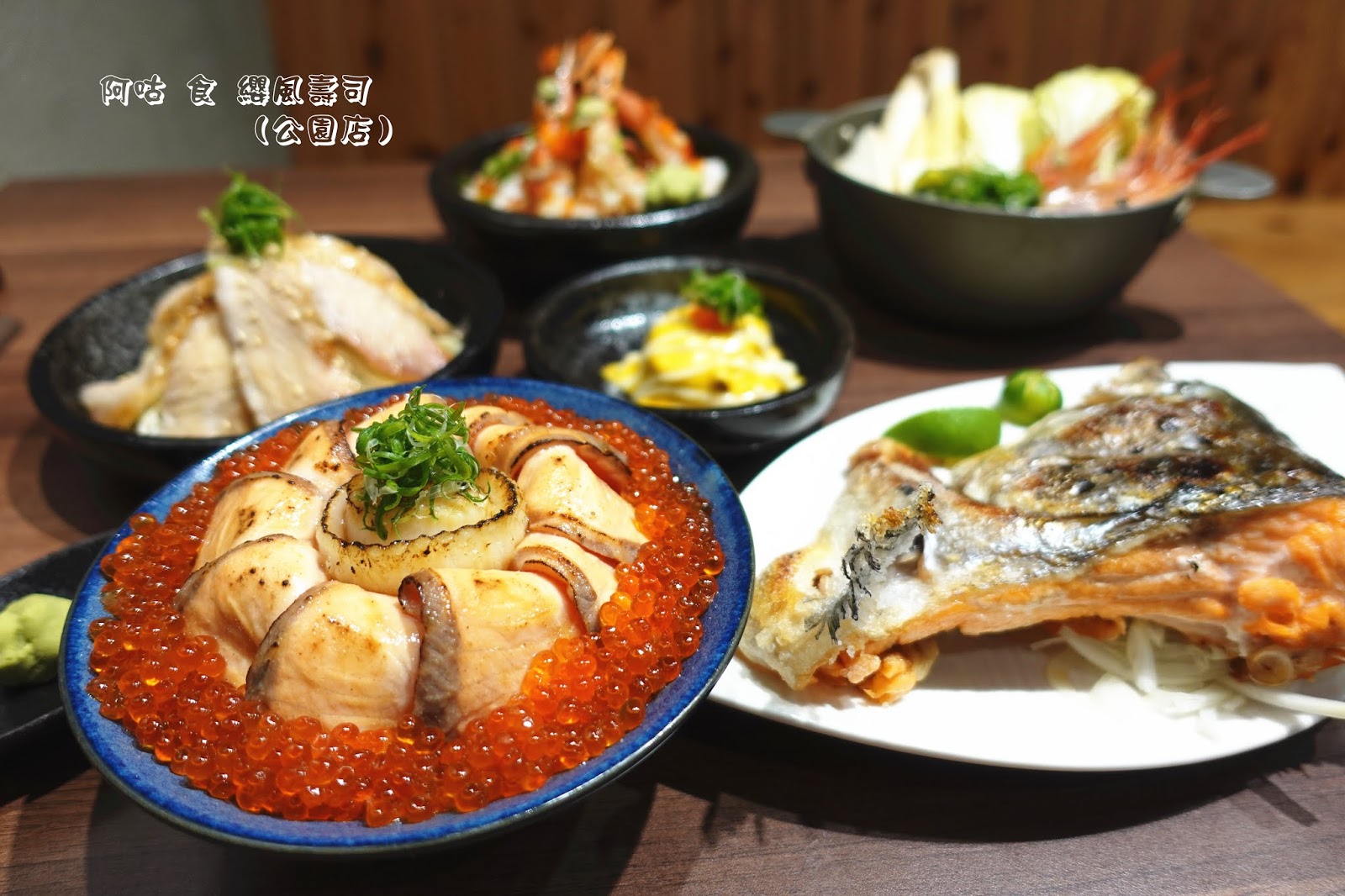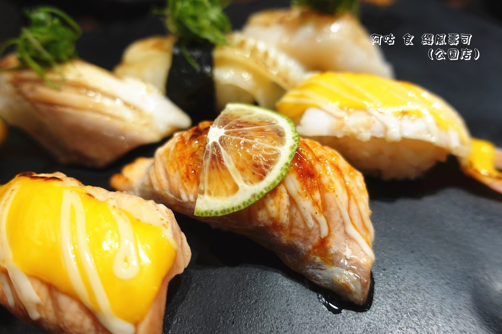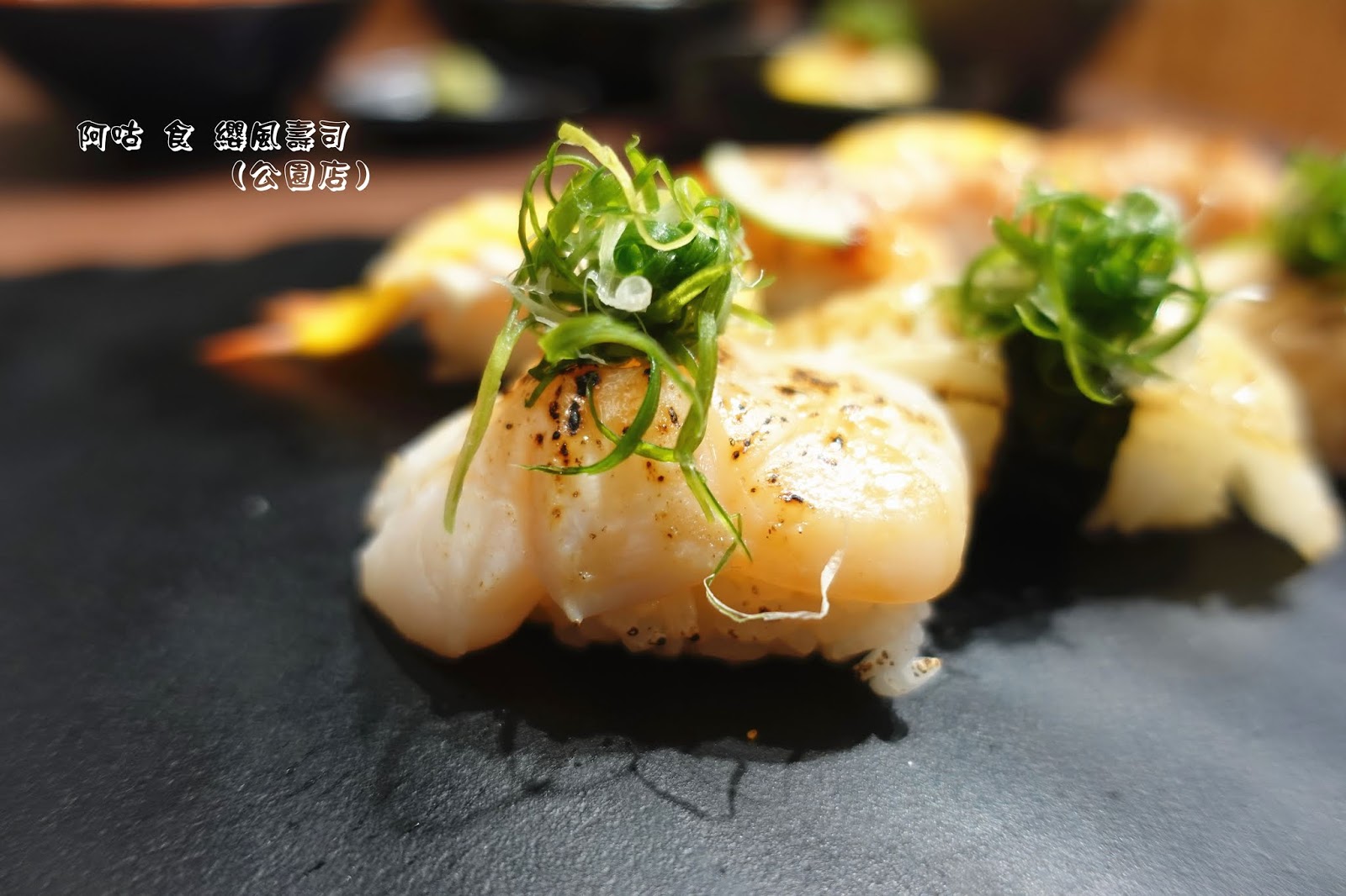除了那眩目的燒炙厚切鮭魚與鮭魚卵外,中間的燒炙比目魚片與生食級干貝,也不甘落於其後地展現其存在。