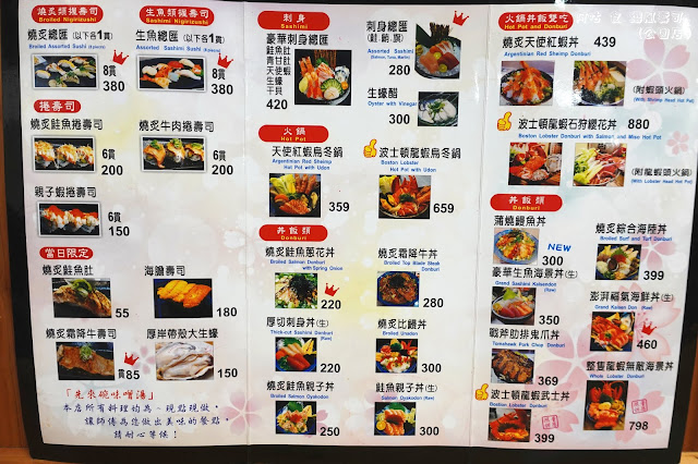 所有餐點都是現點現做,主要提供各種壽司、丼飯、刺身、火鍋與日式小品類,還有火鍋丼飯雙吃的品項。若因品項繁多難以抉擇,可參考人氣排行榜點餐。