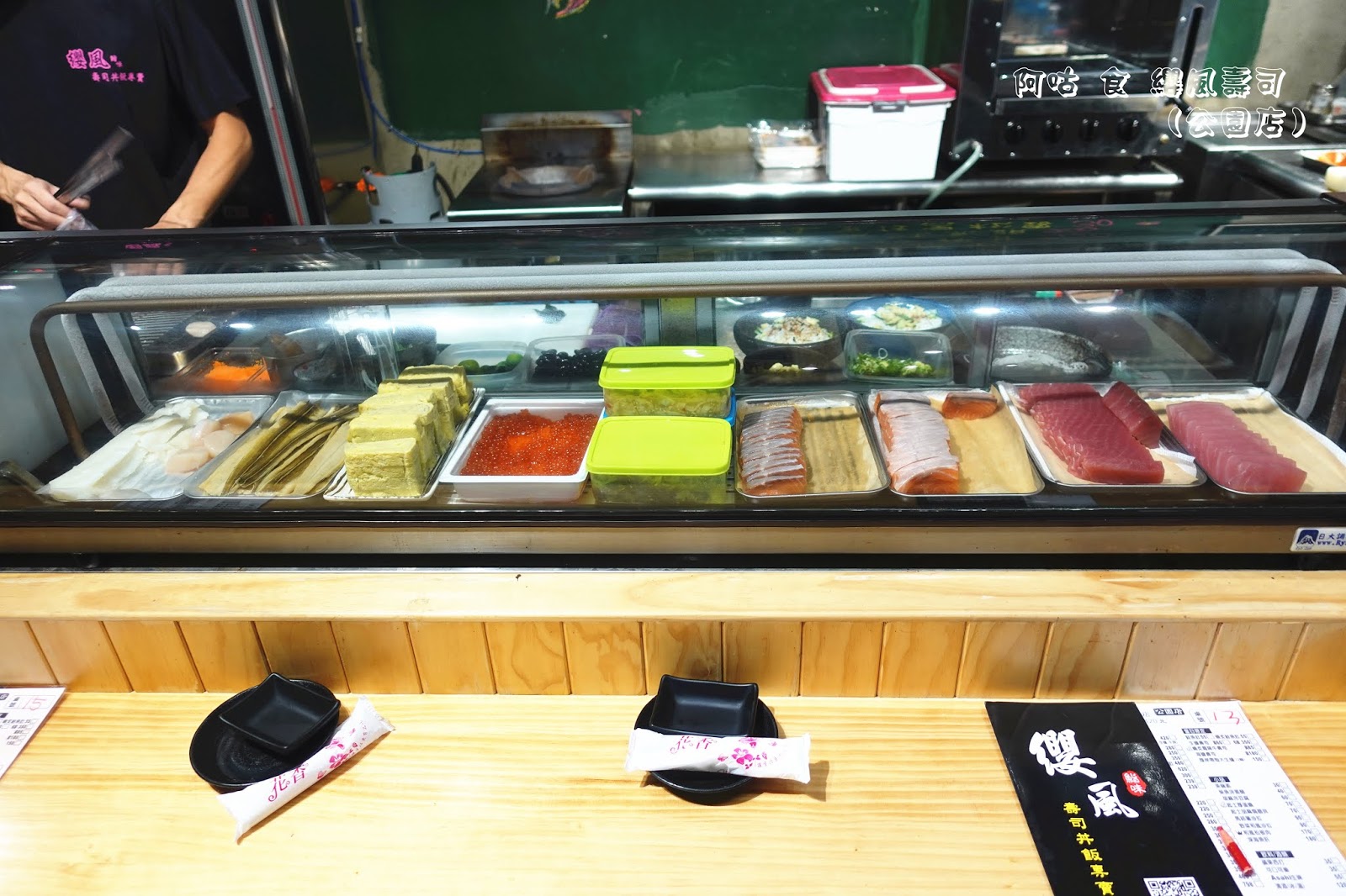 檯前的冰櫃陳列了各種新鮮食材,幾位師傅正熟練地準備著餐點。