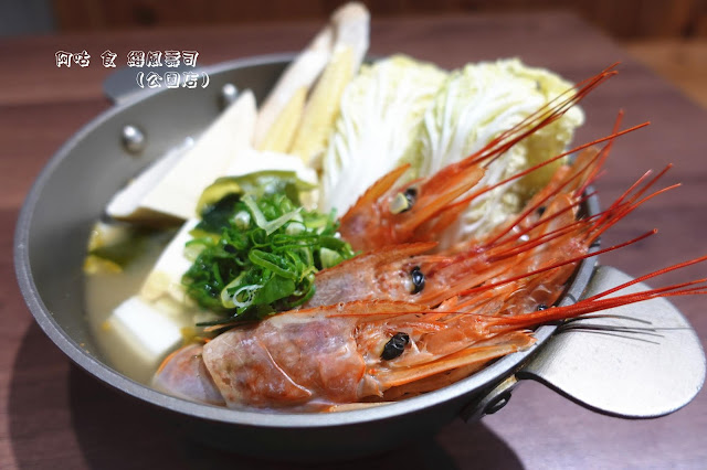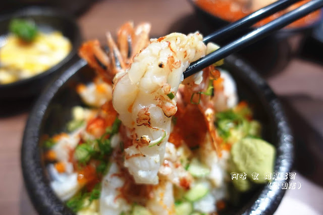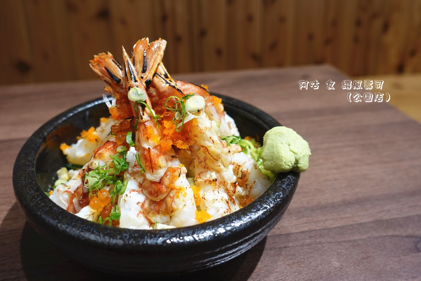 除了數尾燒炙過的天使紅蝦外,尚有蝦卵、鮭魚卵、日式蛋卷塊與蔥花等用料陪襯,山葵泥當然也是不可少的。