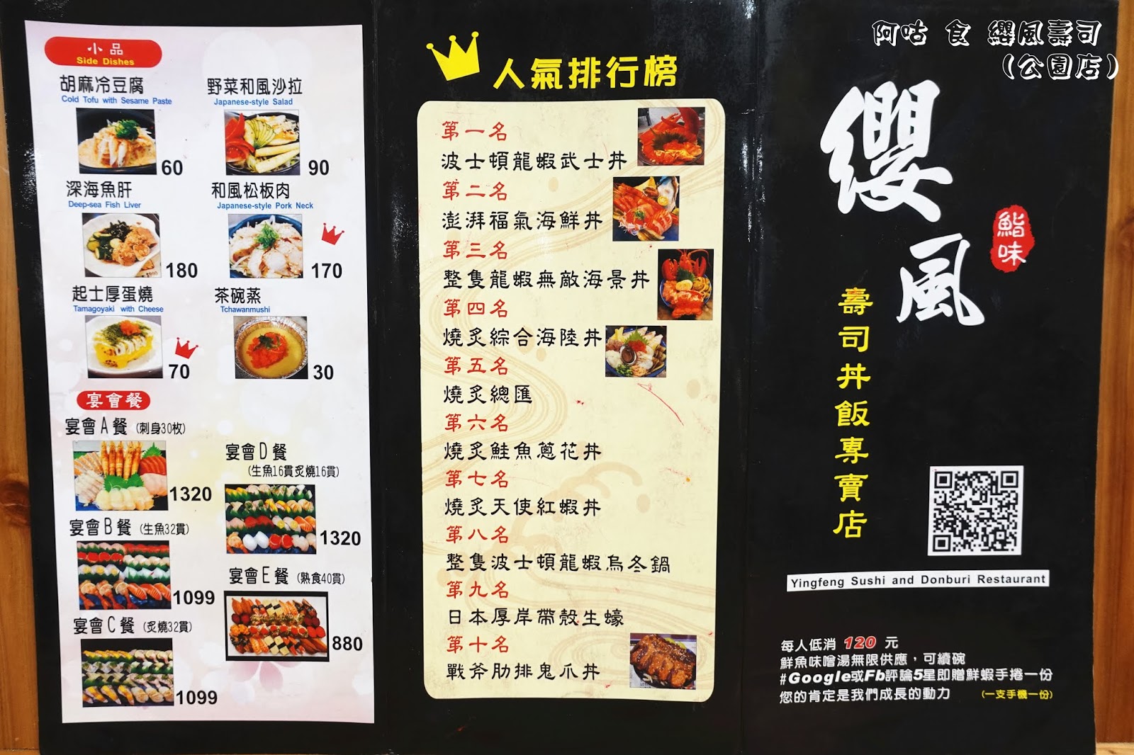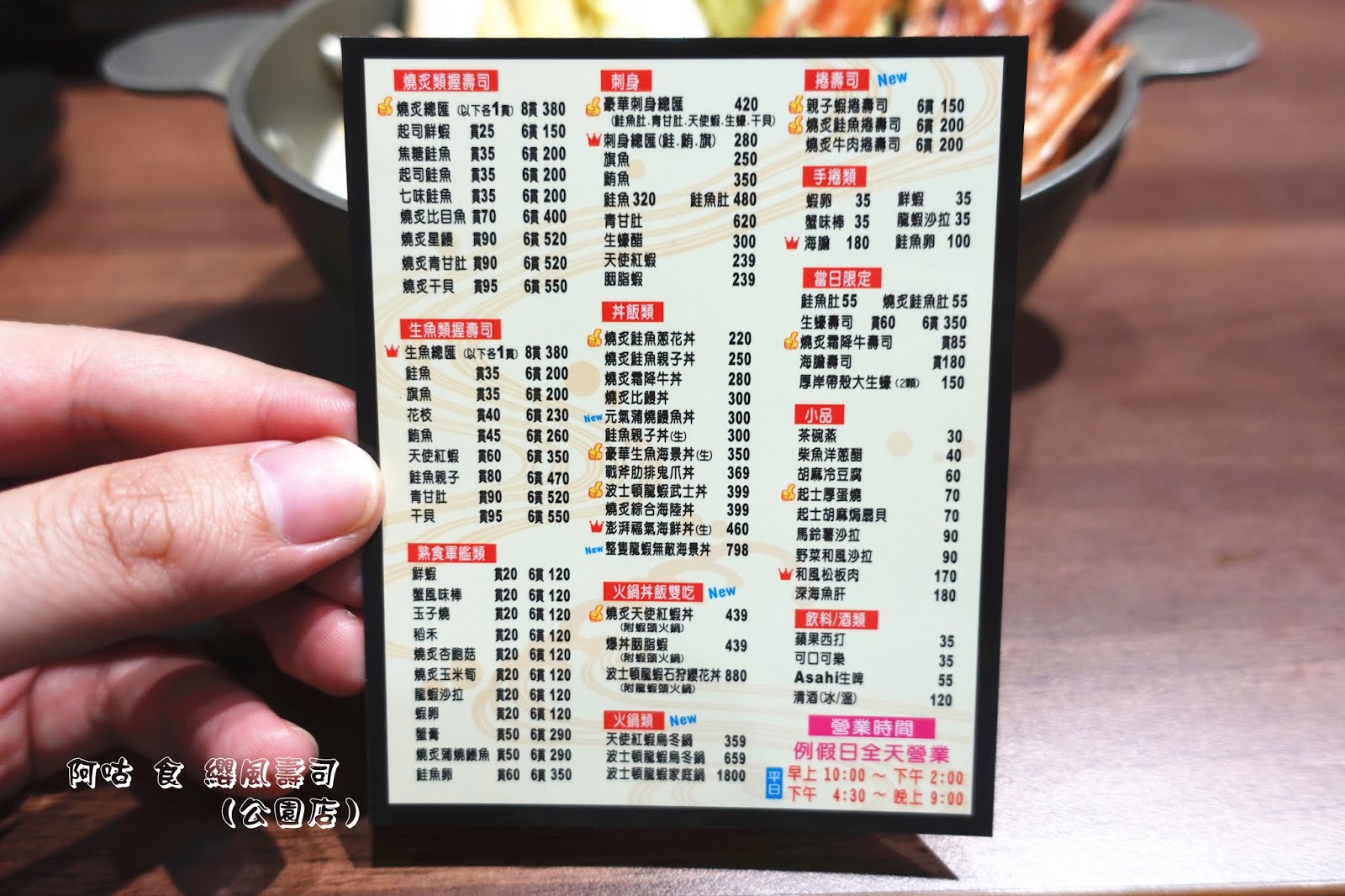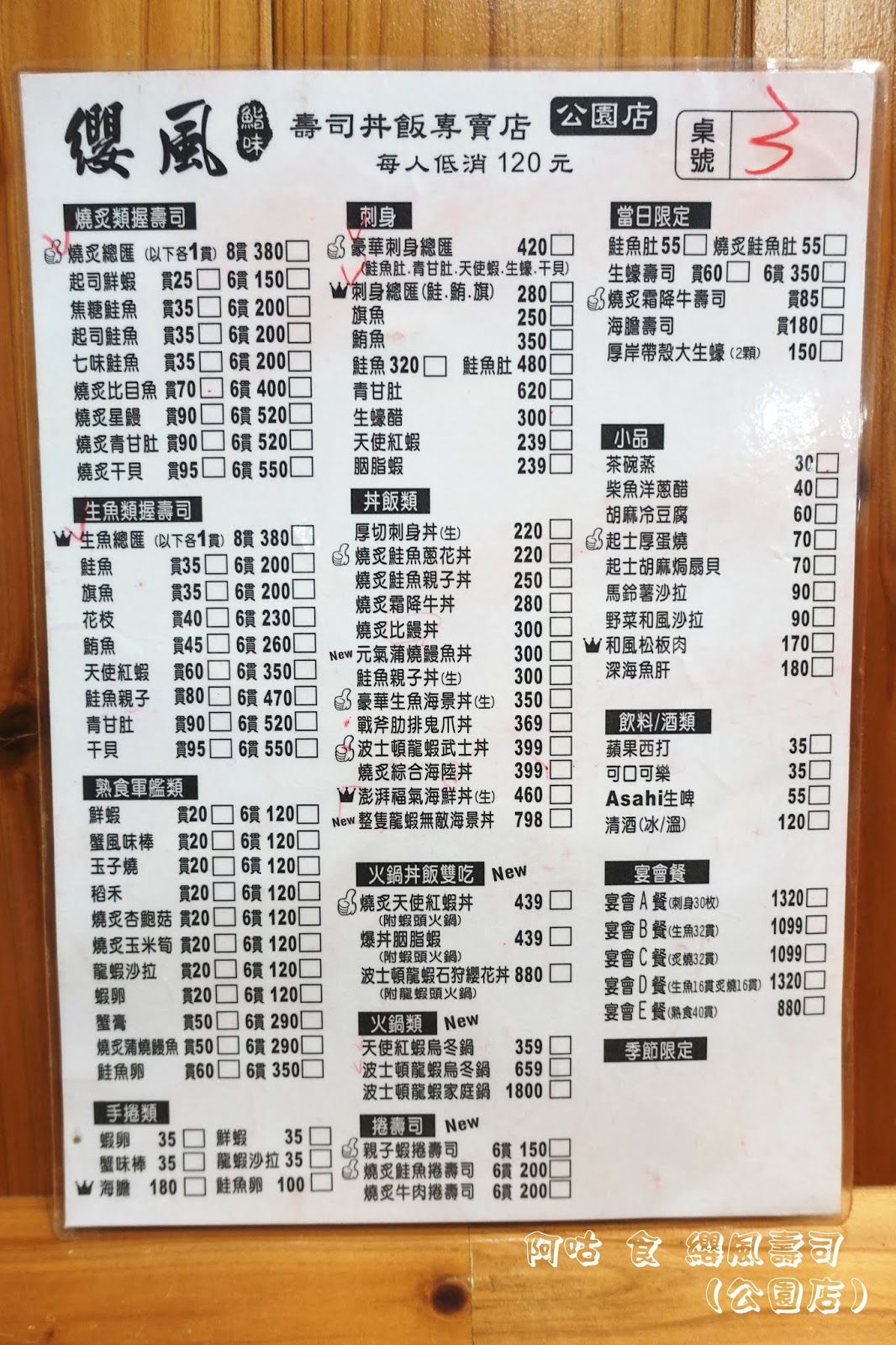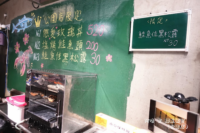 料理區後方牆面寫著公園店限定的三道料理品項與價位。