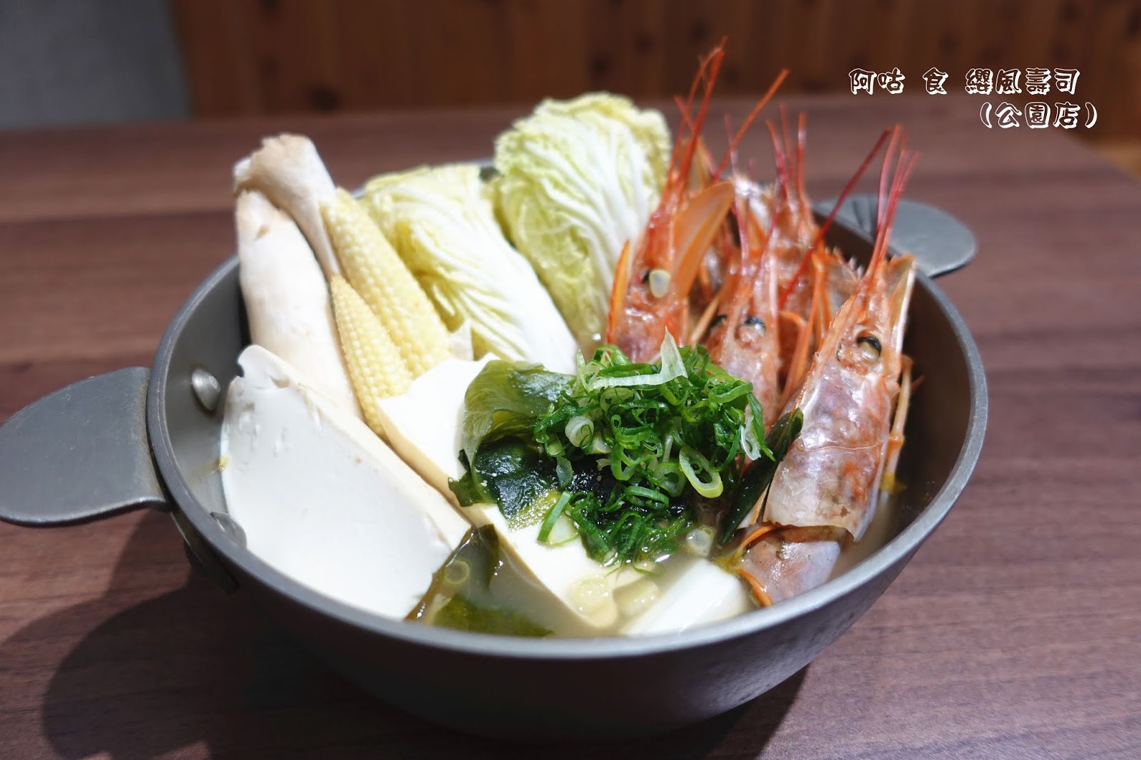 火鍋中除了主角蝦頭外,尚有杏鮑菇、玉米筍、娃娃菜、嫩豆腐、海帶芽與蔥花。