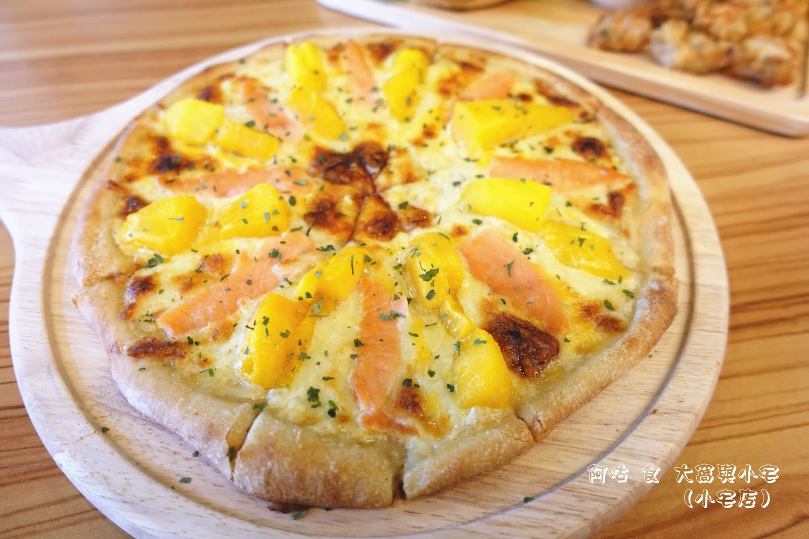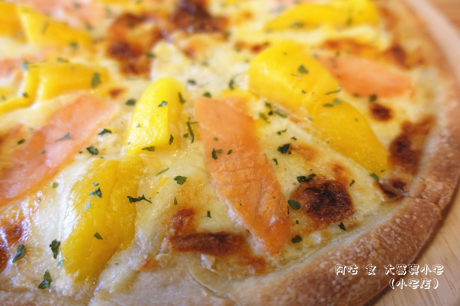 使用的餅皮為老闆製作的手感 Pizza,融化的起司中嵌滿了芒果塊與醃燻鮭魚片,並撒上義式香料增味。