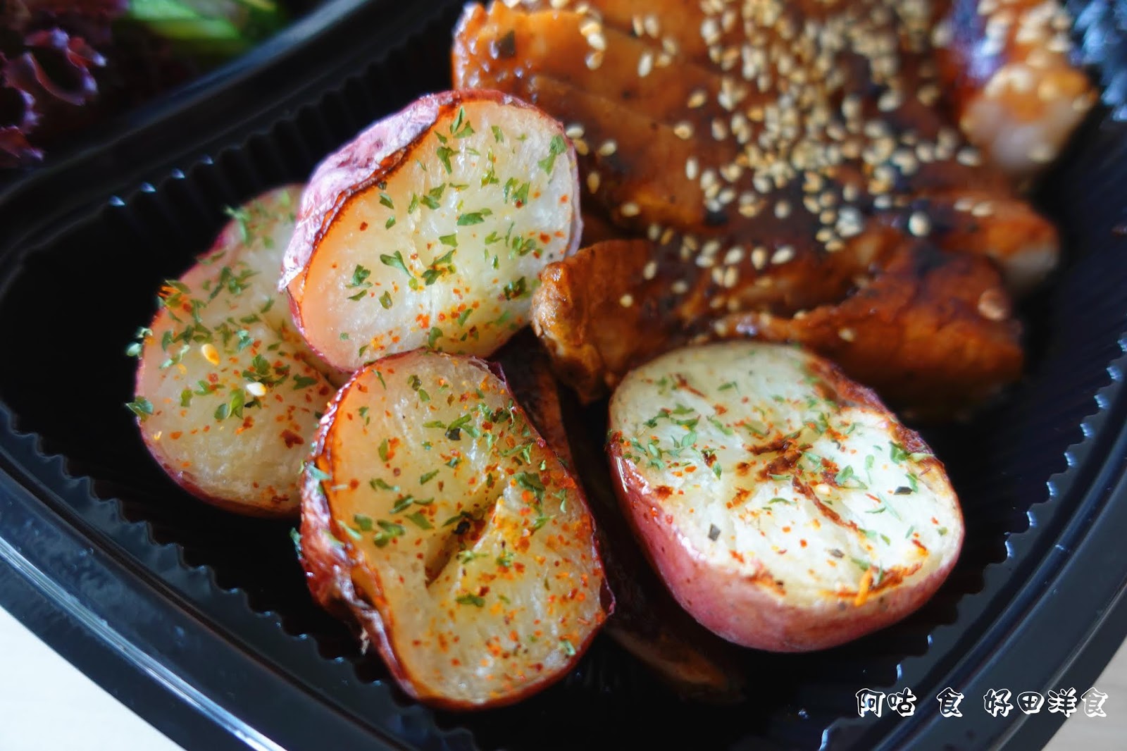 帶皮烤洋芋撒了些許義式香料增味,口感鬆軟綿密,散發著澱粉的香甜。