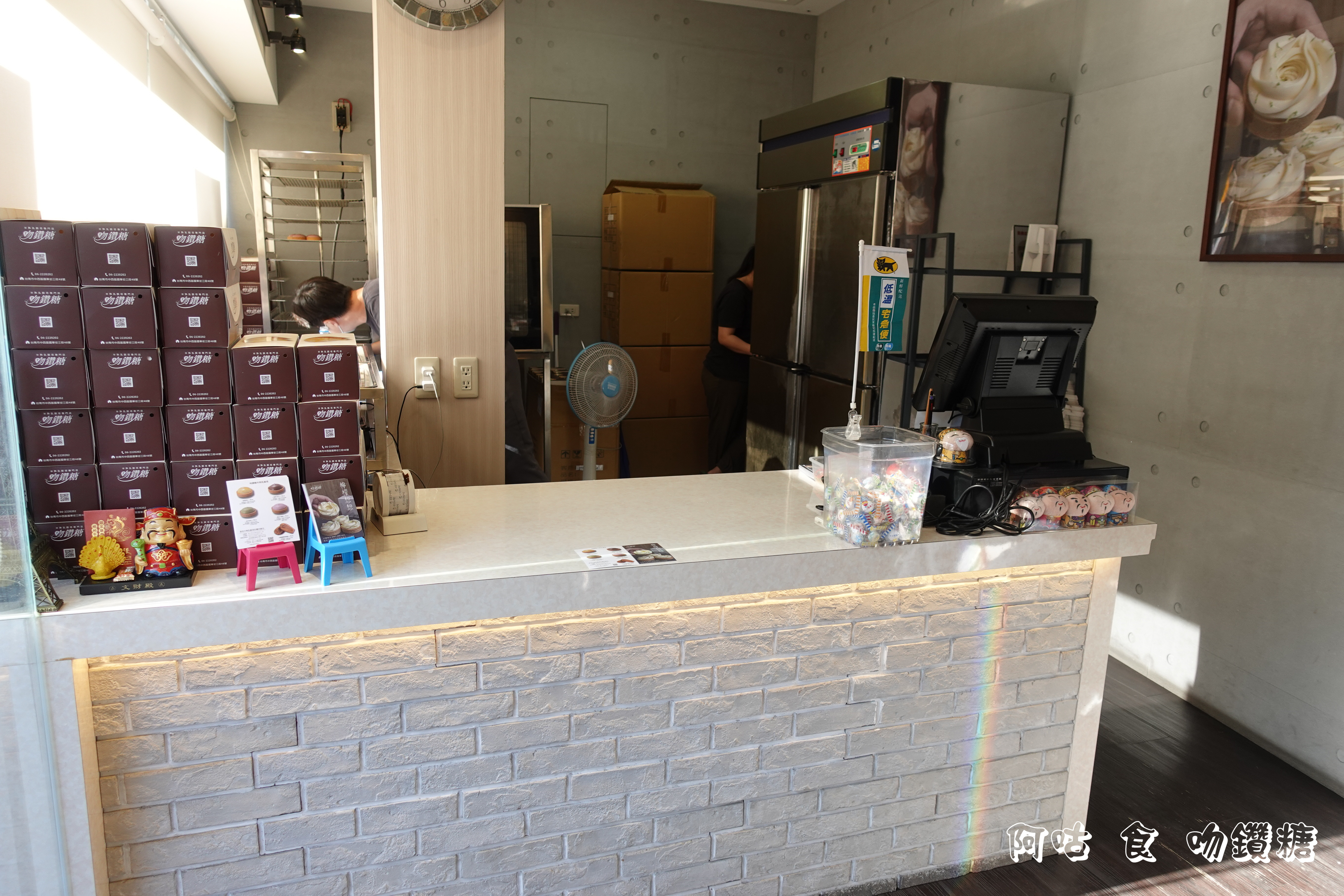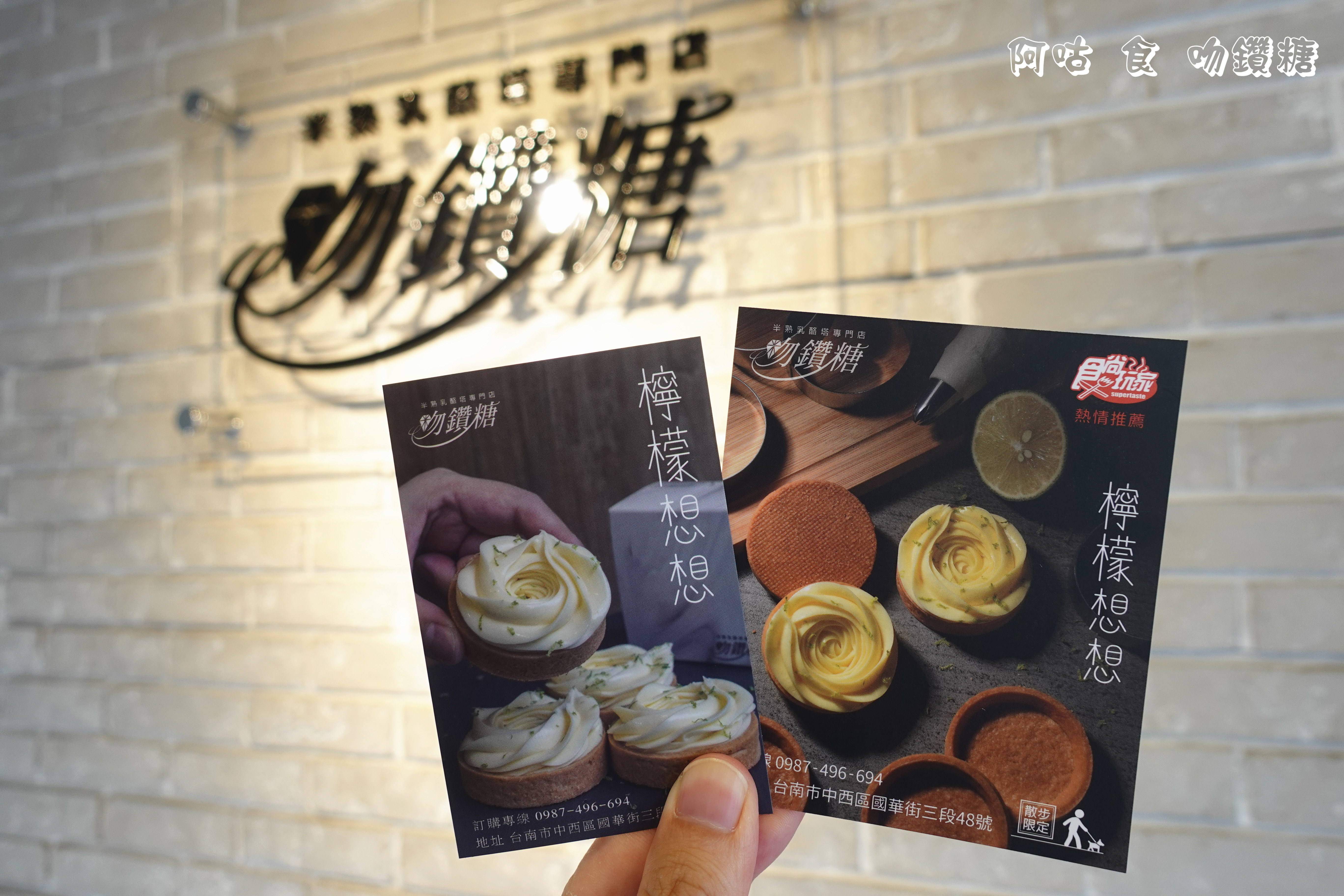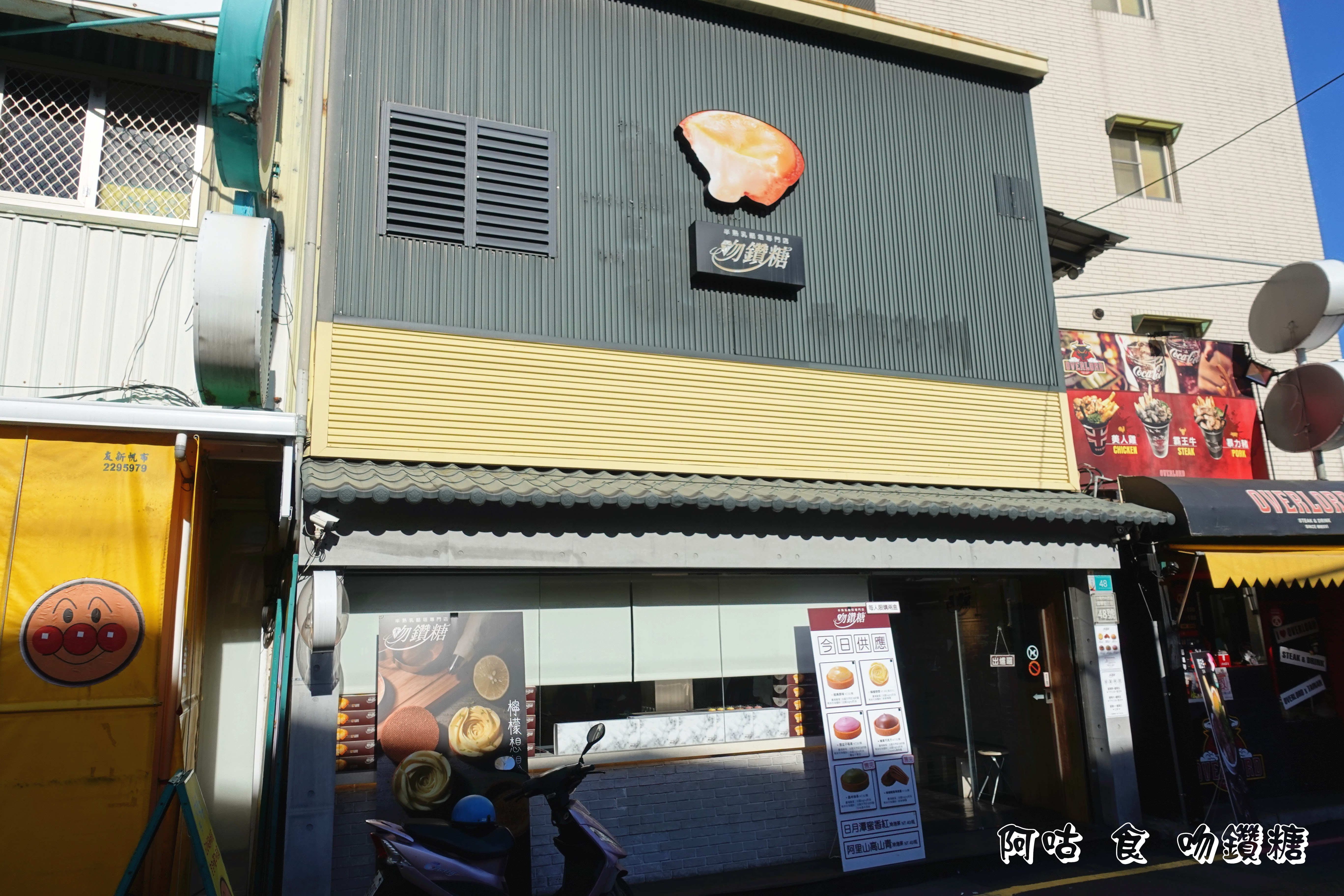吻鑽糖位在國華街三段,上方的乳酪塔招牌滿顯眼。