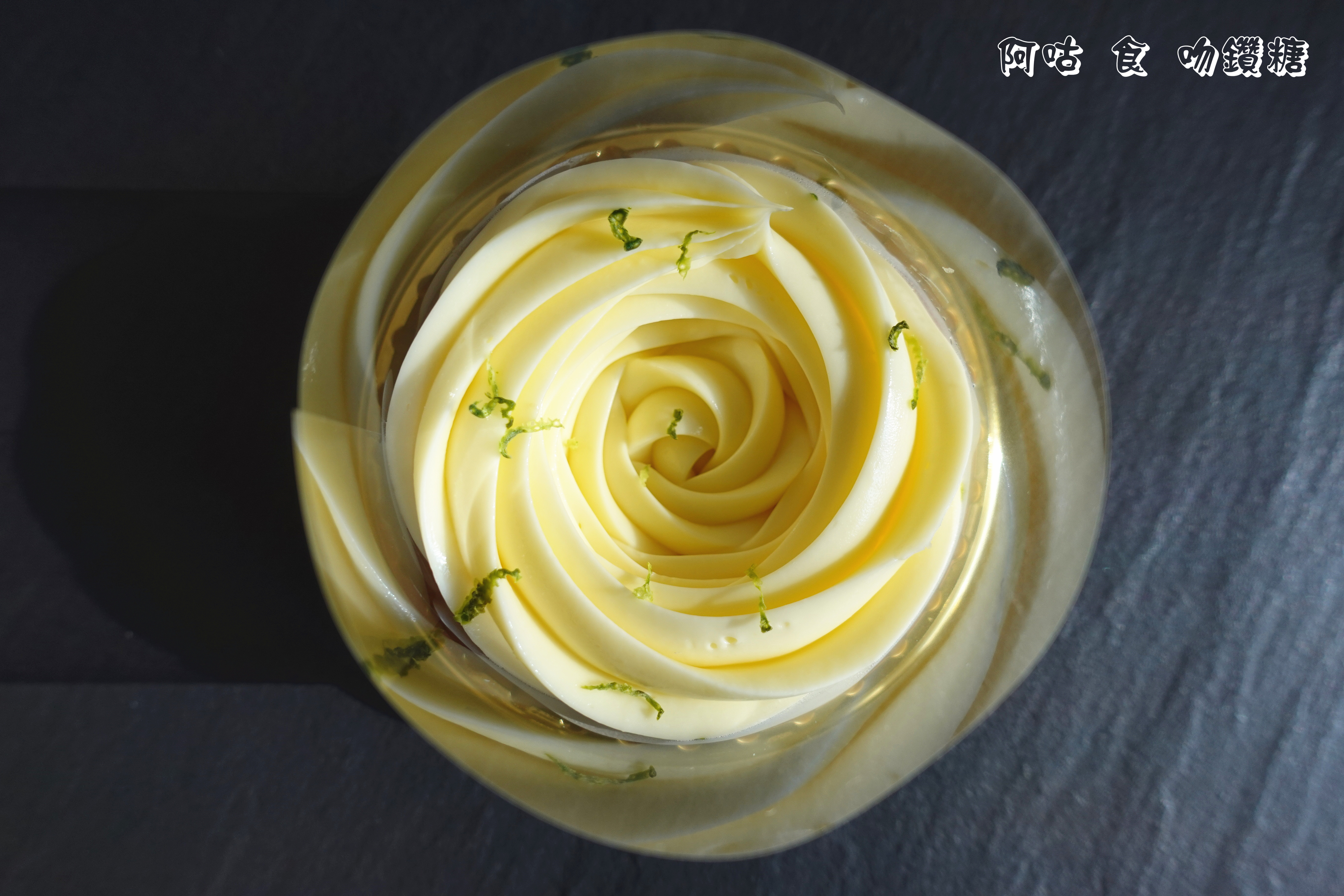 淡黃色檸檬餡的口感宛如冰淇淋般濃滑紮實,爽酸帶甜而不膩,點綴其上的翠綠檸檬皮,除散發著檸檬清香外,其微苦也使餡料甜味更加明顯。