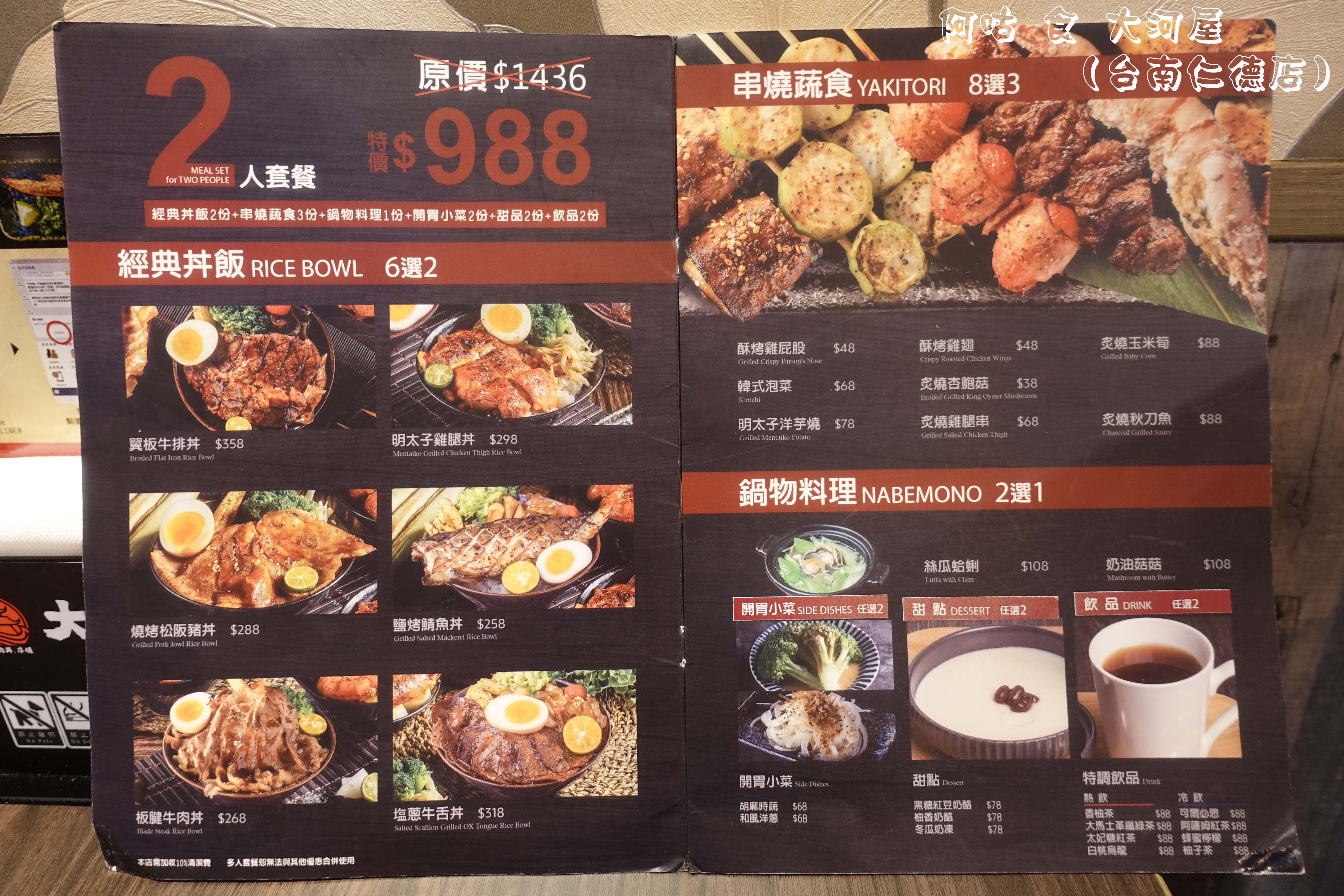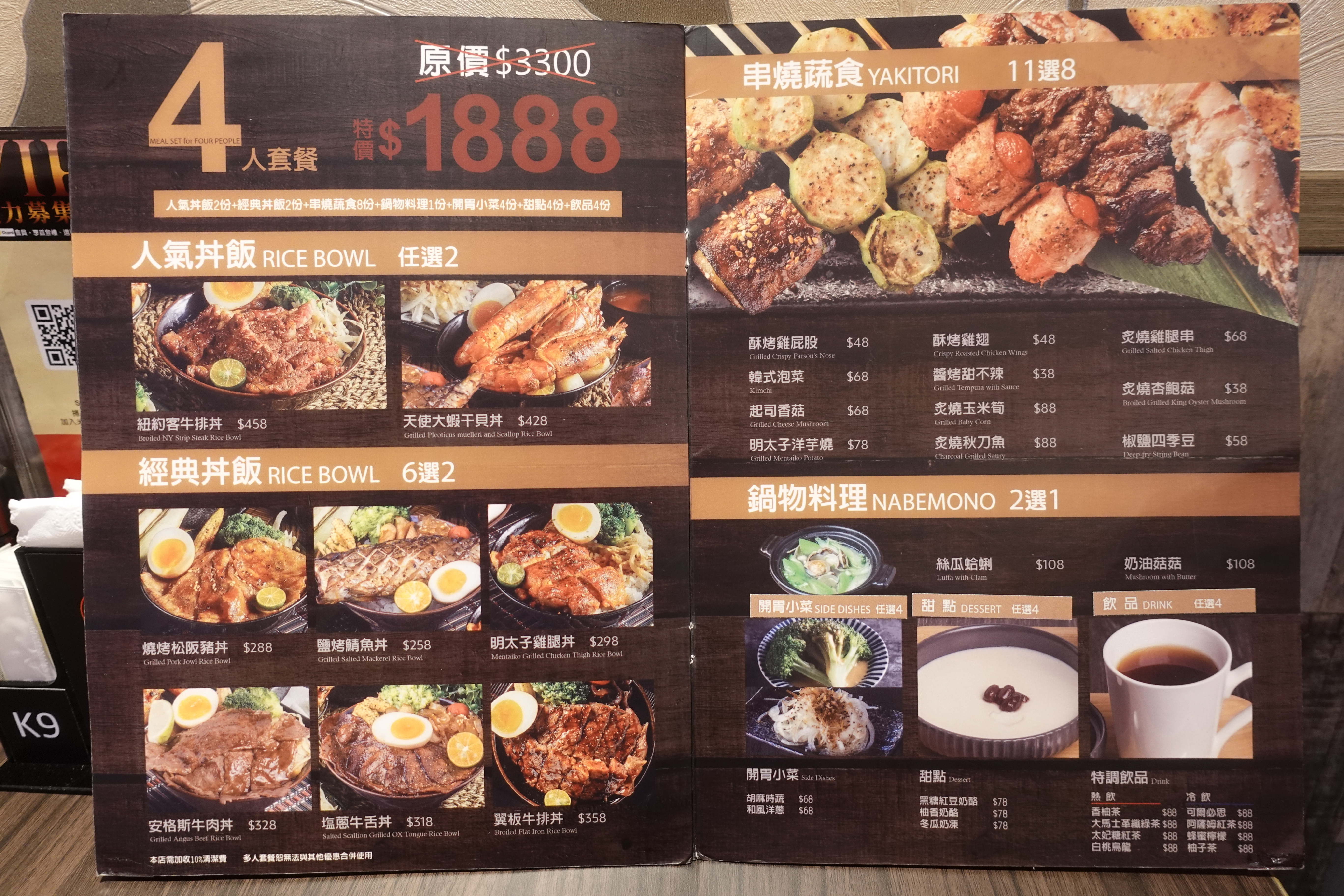 提供的餐點比起先前有不少變動,尤其是多人套餐制的派對分享組合餐,較各自單點優惠許多,有兩人、三人、四人套餐,包含丼飯、串燒蔬食、鍋物料理、開胃小菜、甜點與飲品,依價位有品項與數量的差異。