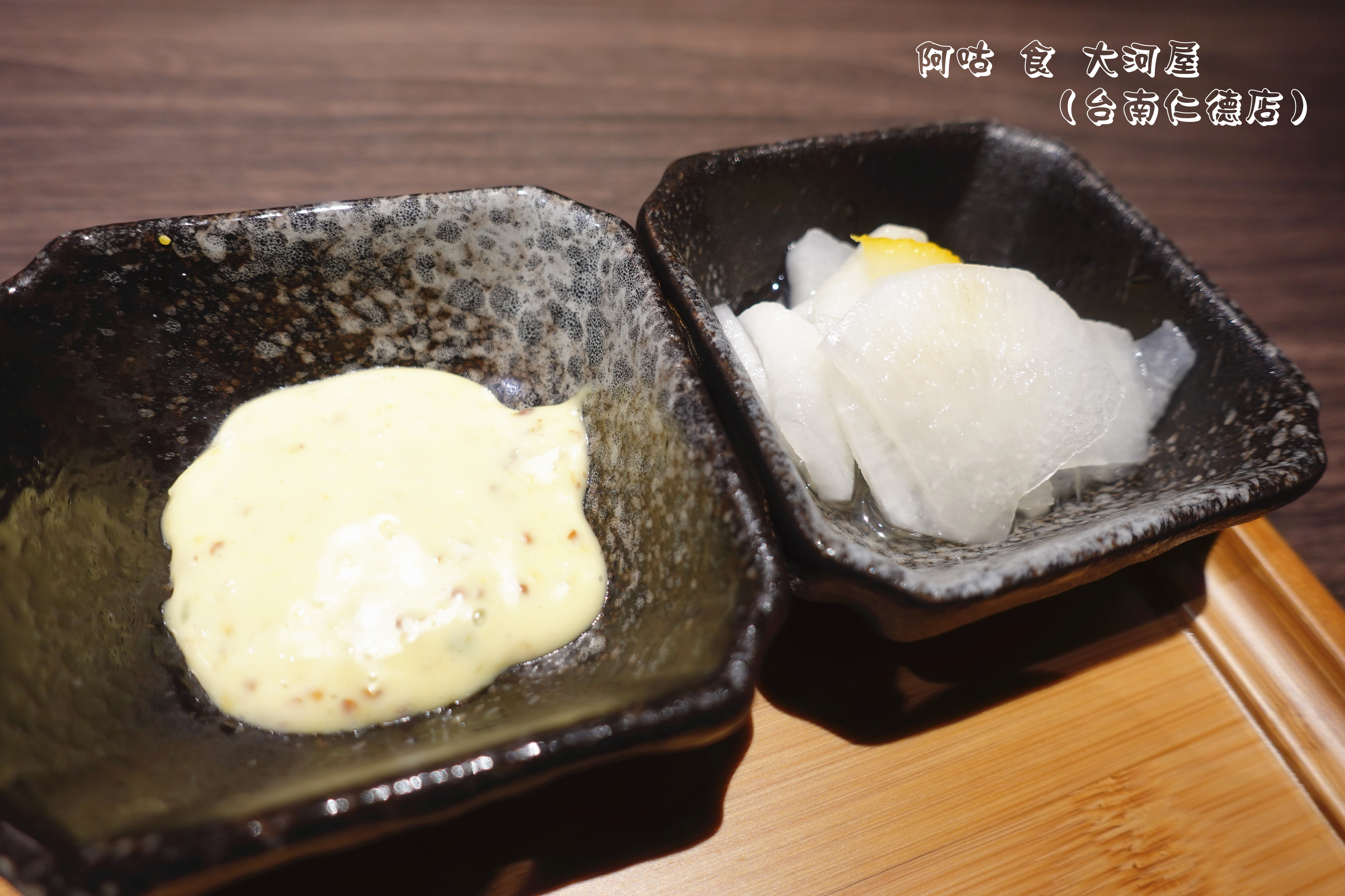 隨餐附漬物與一個陶瓷小盤,漬物為脆甜開胃的涼拌白蘿蔔。