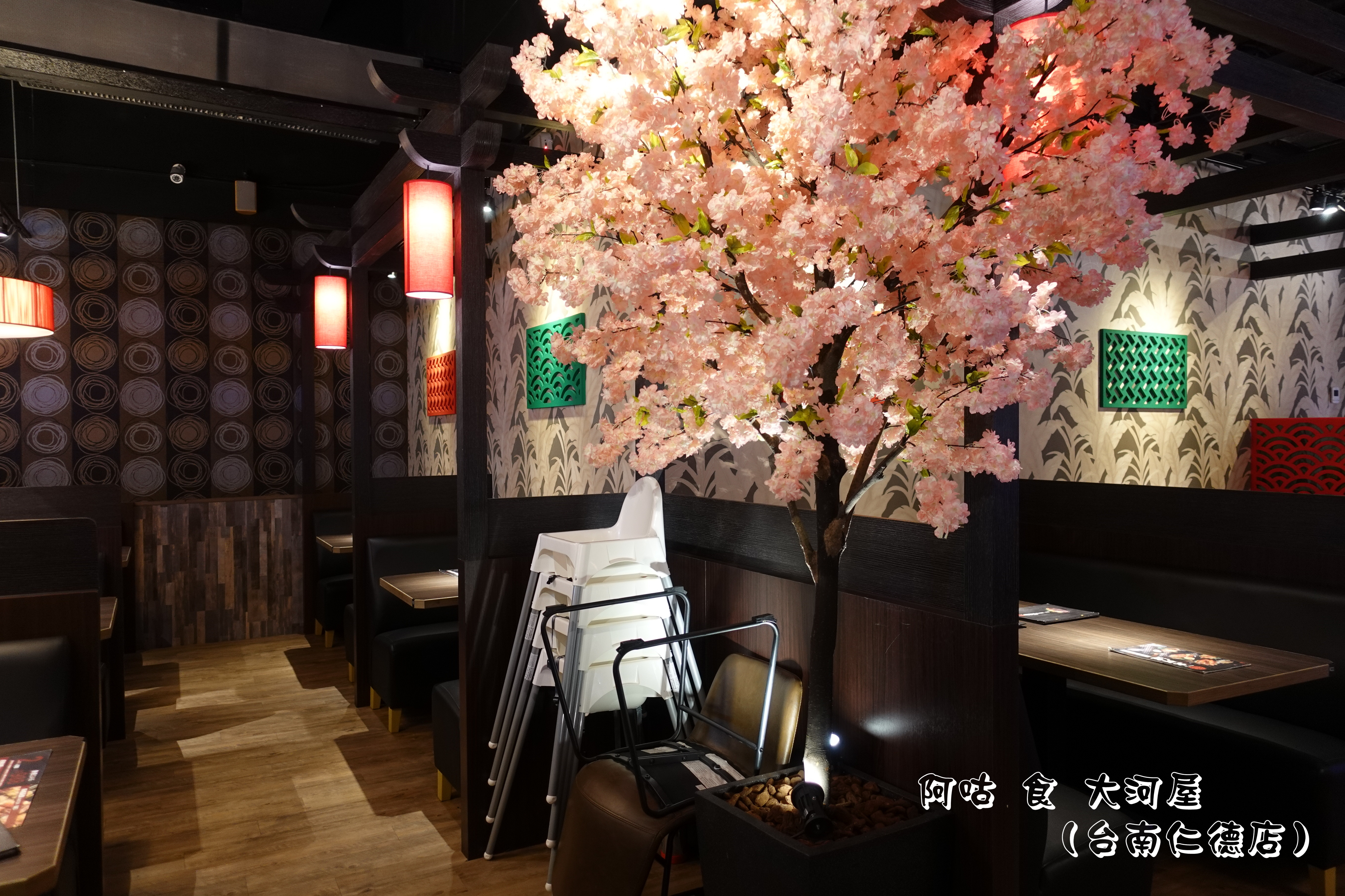 店採深色木桌與沙發椅,坐起來挺舒適;而最具代表性的櫻花造景當然也是不可少的。