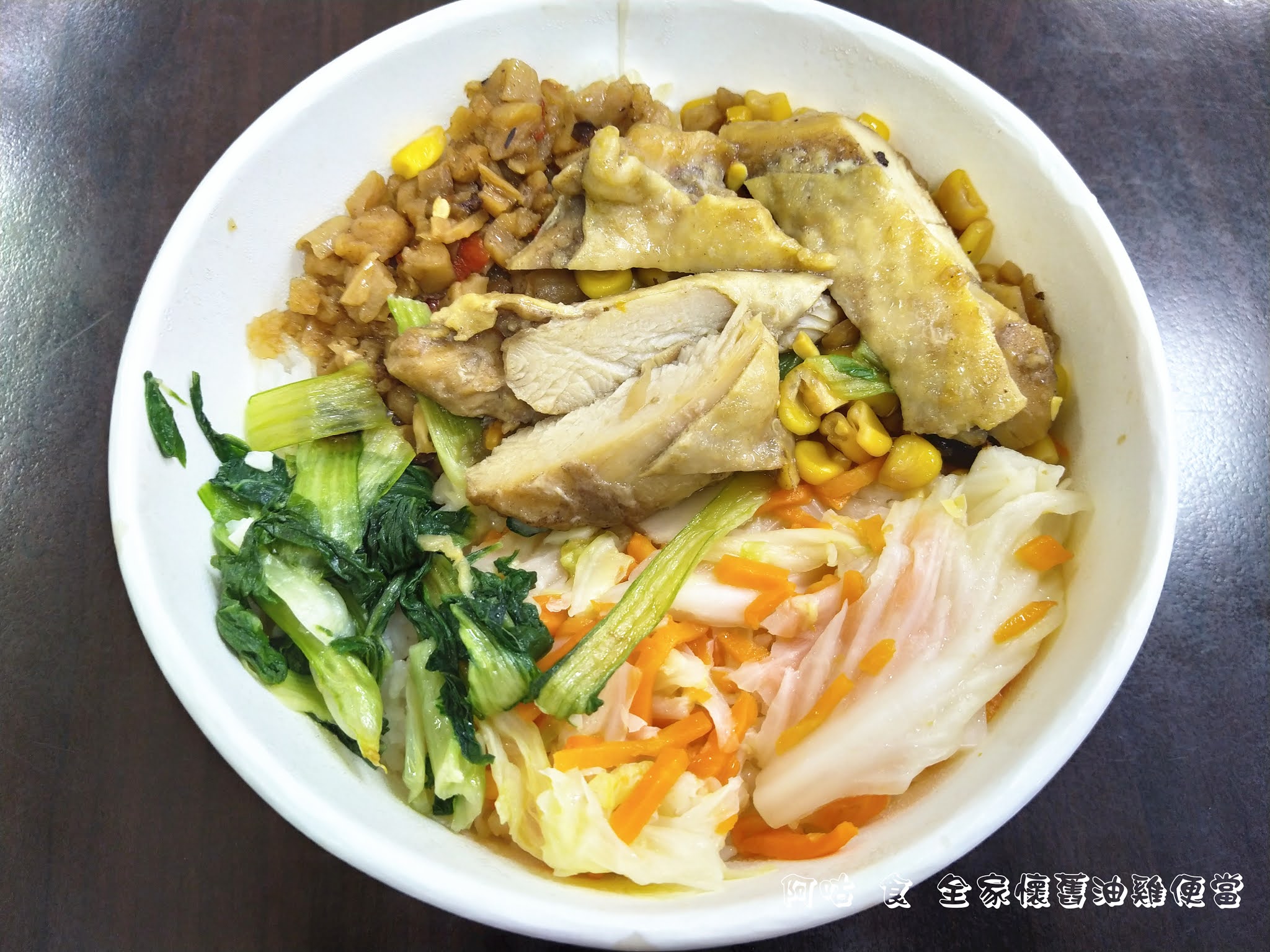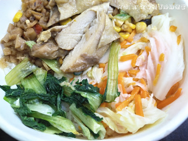 除了主菜油雞外共有三種配菜,分別是炒青江菜、高麗菜炒蘿蔔、玉米菜脯。